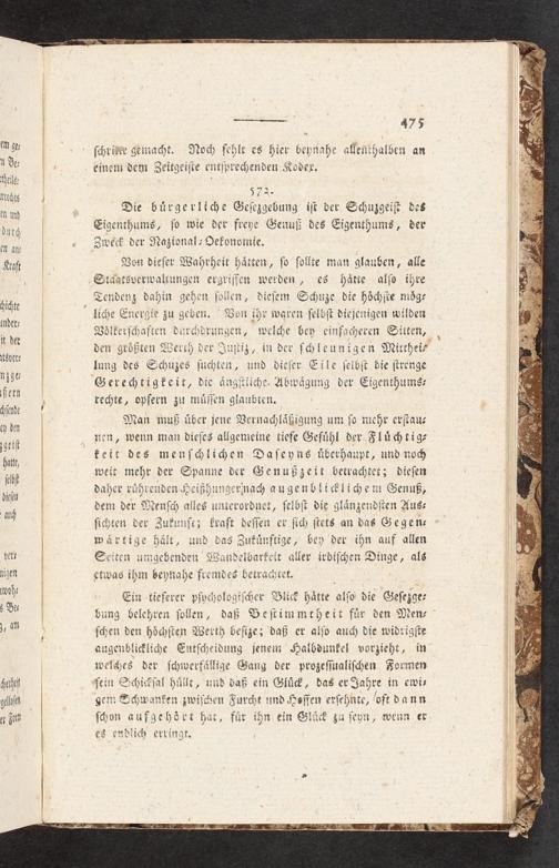 em ge ſchrieee gemacht. Noch fehlt es hier beynahe allenthalben an n R⸗ einem dem Zeitgeiſte entſprechenden Kodex. theils 1— G dects.. 375* umnd. Die buͤrgerliche Geſezgebung iſt der Schuzgeiſt des durch V Eigenthums, ſo wie der freye Genuß des Eigenthums, der an.„ Zweck der Nazional⸗Oekonomie. Krft Von dieſer Wahrheit haͤtten, ſo ſollte man glauben, alle Staatsverwaltungen ergriſſen werden, es haͤtte alſo ihre ſie Tendenz dahin gehen ſollen, dieſem Schuze die hoͤchſte moͤg⸗ d liche Energie zu geben. Von ihr waren ſelbſt diejenigen wilden nie Voͤlkerſchaften durchdrungen, welche bey einfacheren Sitten, 1 den groͤßten Werth der Juſtiz, in der ſchleunigen Mitthei⸗ zäntt⸗ lung des Schuzes ſuchten, und dieſer Eile ſelbſt die ſtrenge nige Gerechtigkeit, die aͤngſtliche. Abwaͤgung der Eigenthums⸗ 15. rechte, opfern zu muͤſſen glaubten. e) d Man muß uͤber jene Vernachlaͤßigung um ſo mehr erſtau⸗ geit nen, wenn man dieſes allgemeine tiefe Gefuͤhl der Fluͤchtig⸗ bate keit des menſchlichen Daſeyns uͤberhaupt, und noch cbt weit mehr der Spanne der Genußzeit betrachtet; dieſen dinn daher ruͤhrenden Heißhungernach a ugenb lickt iche m Genuß, dem der Menſch alles unterordnet, ſelbſt die glaͤnzendſten Aus⸗ Ba ſichten der Zukunſt; kraft deſſen er ſich ſtets an das Gegen⸗ waͤrtige haͤlt, und das Zukuͤnftige, bey der ihn auf allen verr Seiten umgebenden Wandelbarkeit aller irdiſchen Dinge, als nigen etwas ihm beynahe fremdes betrachtet. vo Ein tieferer pſychologiſcher Blick haͤtte alſo die Geſezge⸗ 5 Bu bung belehren ſollen, daß Beſtimmtheit fuͤr den Men⸗ 7 am. ſchen den hoͤchſten Werth beſize; daß er alſo auch die widrigſte augenblickliche Entſcheidung jenem Halbdunkel vorzieht, in welches der ſchwerfaͤllige Gang der prozeſſualiſchen Formen hethet ſein Schickſal huͤllt, und daß ein Gluͤck, das er Jahre in ewi— gelloen gem Schwanken zwiſchen Furcht und Hoffen erſehnte, oft dann er Folt ſchon aufgehoͤrt hat, fuͤr ihn ein Gluͤck zu ſeyn, wenn er es endlich erringt. „