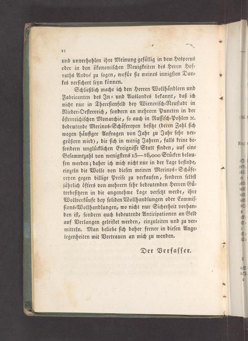 v und unverhohlen ihre Meinung gefaͤllig in dem Hesperus oder in den öͤkonomiſchen Neuigkeiten des Herrn Hof— raths André zu ſagen, wofuͤr ſie meines innigſten Dan— kes verſichert ſeyn koͤnnen. Schließlich mache ich den Herren Wollhaͤndlern und Fabricanten des In- und Auslandes bekannt, daß ich nicht nur in Thereſienfeld bey Wieneriſch-Neuſtadt in Nieder⸗Oeſterreich, ſondern an mehrern Puncten in der oͤſterreichiſchen Monarchie, ſo auch in Ruſſiſch-Pohlen ꝛc. bedeutende Merinos⸗Schaͤfereyen beſitze(deren Zahl ſich wegen haͤufiger Anfragen von Jahr zu Jahr ſehr ver⸗ groͤßern wird), die ſich in wenig Jahren, falls keine be— ſondern ungluͤcklichen Ereigniſſe Statt finden, auf eine Geſammtzahl von wenigſtens 15— 16,000 Stuͤcken belau⸗ fen werden; daher ich mich nicht nur in der Lage befinde, einzeln die Wolle von dieſen meinen Merinos⸗Schaͤfe⸗ reyen gegen billige Preiſe zu verkaufen, ſondern ſelbſt jaͤhrlich oͤfters von mehrern ſehr bedeutenden Herren Guͤ— terbeſitzern in die angenehme Lage verſetzt werde, ihre Wollverkaͤufe bey ſoliden Wollhandlungen oder Commiſ— ſions⸗Wollhandlungen, wo nicht nur Sicherheit vorhan— den iſt, ſondern auch bedeutende Anticipationen an Geld auf Verlangen geleiſtet werden, einzuleiten und zu ver—