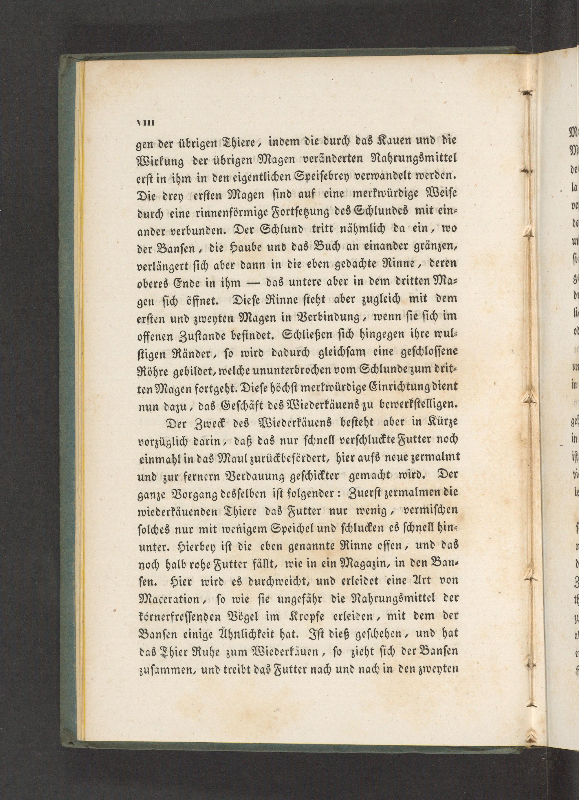 VIII gen der übrigen Thiere, indem die durch das Kauen und die Wirkung der übrigen Magen veränderten Nahrungsmittel erſt in ihm in den eigentlichen Speiſebrey verwandelt werden. Die drey erſten Magen ſind auf eine merkwürdige Weiſe durch eine rinnenförmige Fortſetzung des Schlundes mit ein⸗ ander verbunden. Der Schlund tritt nähmlich da ein, wo der Banſen, die Haube und das Buch an einander gränzen, verlängert ſich aber dann in die eben gedachte Rinne, deren oberes Ende in ihm— das untere aber in dem dritten Ma— gen ſich öffnet. Dieſe Rinne ſteht aber zugleich mit dem erſten und zweyten Magen in Verbindung, wenn ſie ſich im offenen Zuſtande befindet. Schließen ſich hingegen ihre wul⸗ ſtigen Ränder, ſo wird dadurch gleichſam eine geſchloſſene Röhre gebildet, welche ununterbrochen vom Schlunde zum drit⸗ ten Magen fortgeht. Dieſe höchſt merkwürdige Einrichtung dient nun dazu, das Geſchäft des Wiederkäuens zu bewerkſtelligen.