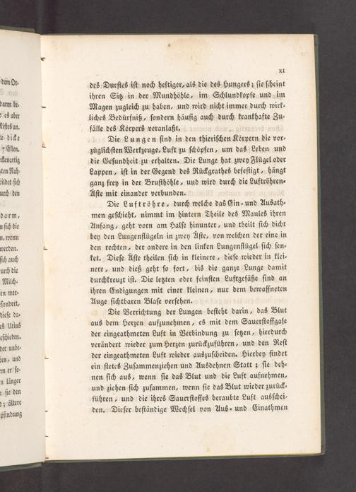 Die Verrichtung der Lungen beſteht darin, das Blut aus dem Herzen aufzunehmen, es mit dem Sauerſtoffgaſe der eingeathmeten Luft in Verbindung zu ſetzen⸗ hierdurch verändert wieder zum Herzen zurückzuführen, und den Reſt der eingeathmeten Luft wieder auszuſcheiden. Hierbey findet ein ſtetes Zuſammenziehen und Ausdehnen Statt; ſie deh⸗ nen ſich aus, wenn ſie das Blut und die Luft aufnehmen, und ziehen ſich zuſammen, wenn ſie das Blut wieder zurück⸗ führen, und die ihres Sauerſtoffes beraubte Luft ausſchei⸗ den. Dieſer beſtändige Wechſel von Aus⸗ und Einathmen
