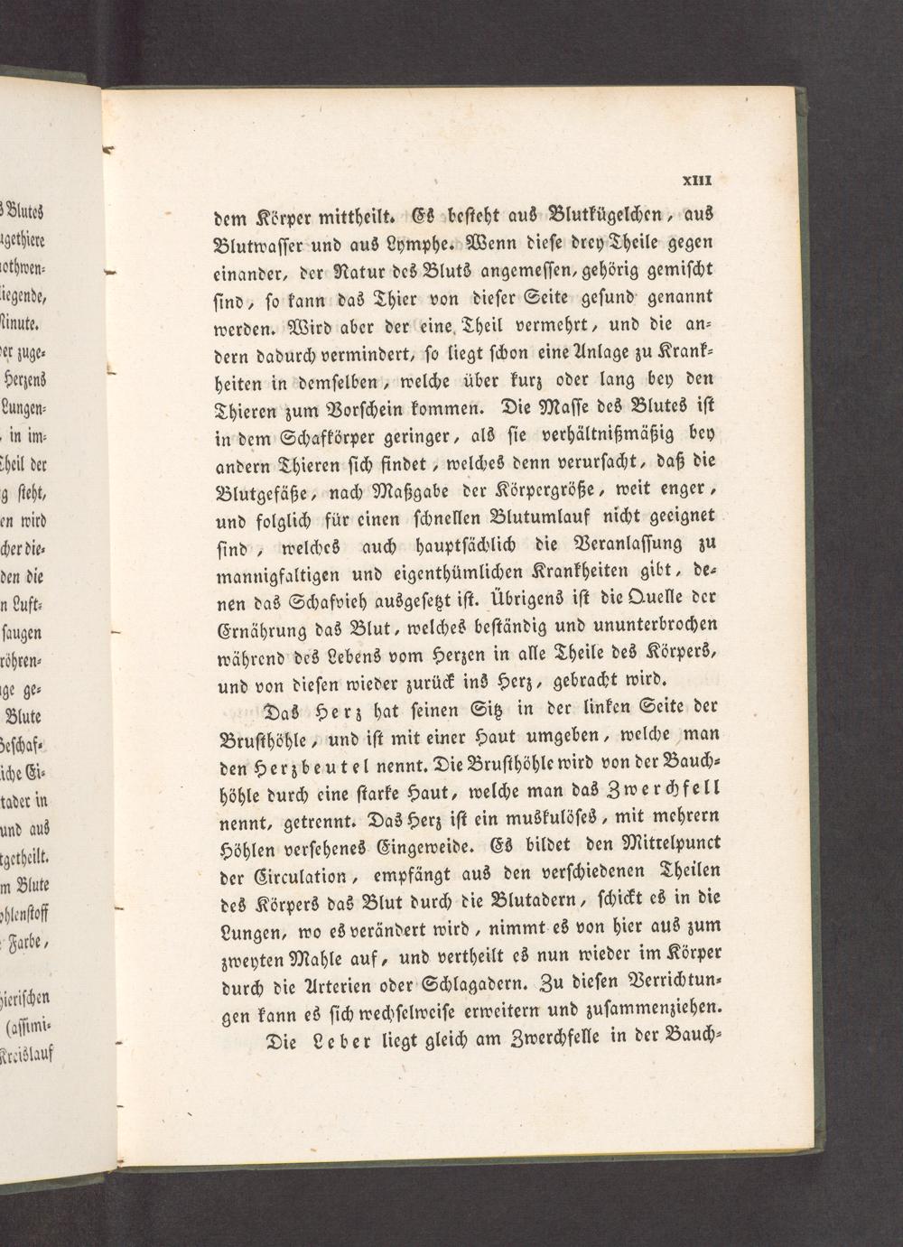 dem Körper mittheilt. Es beſteht aus Blutkügelchen, aus Blutwaſſer und aus Lymphe. Wenn dieſe drey Theile gegen einander, der Natur des Bluts angemeſſen, gehörig gemiſcht ſind, ſo kann das Thier von dieſer Seite geſund genannt werden. Wird aber der eine Theil vermehrt, und die an⸗ dern dadurch vermindert, ſo liegt ſchon eine Anlage zu Krank⸗ heiten in demſelben, welche über kurz oder lang bey den Thieren zum Vorſchein kommen. Die Maſſe des Blutes iſt in dem Schafkörper geringer, als ſie verhältnißmäßig bey andern Thieren ſich findet, welches denn verurſacht, daß die Blutgefäße, nach Maßgabe der Körpergröße, weit enger, und folglich für einen ſchnellen Blutumlauf nicht geeignet ſind, welches auch hauptſächlich die Veranlaſſung zu mannigfaltigen und eigenthümlichen Krankheiten gibt, de⸗ nen das Schafvieh ausgeſetzt iſt. Übrigens iſt die Quelle der Ernährung das Blut, welches beſtändig und ununterbrochen während des Lebens vom Herzen in alle Theile des Körpers, und von dieſen wieder zurück ins Herz, gebracht wird.