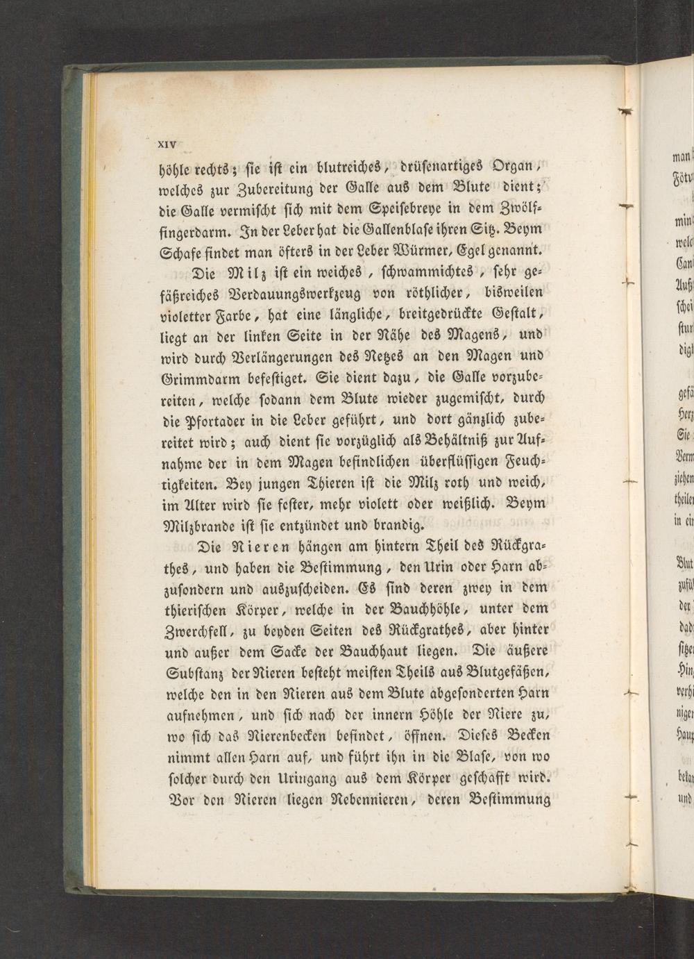 höhle rechts; ſie iſt ein blutreiches, drüſenartiges Organ, ni welches zur Zubereitung der Galle aus dem Blute dient; Föti die Galle vermiſcht ſich mit dem Speiſebreye in dem Zwölf⸗— 4 fingerdarm. In der Leber hat die Gallenblaſe ihren Sitz. Beym mn Schafe ſindet man öfters in der Leber Würmer, Egel genannt. welc Die Milz iſt ein weiches, ſchwammichtes, ſehr ge⸗ V ban fäßreiches Verdauungswerkzeug von röthlicher, bisweilen Lu violetter Farbe, hat eine längliche, breitgedrückte Geſtalt, ſchi liegt an der linken Seite in der Nähe des Magens, und ſtur wird durch Verlängerungen des Netzes an den Magen und dis Grimmdarm befeſtiget. Sie dient dazu, die Galle vorzube⸗ reiten, welche ſodann dem Blute wieder zugemiſcht, durch 5 die Pfortader in die Leber geführt, und dort gänzlich zube⸗ V bern reitet wird; auch dient ſie vorzüglich als Behältniß zur Auf⸗ Sie nahme der in dem Magen befindlichen überflüſſigen Feuch⸗ b Vern tigkeiten. Bey jungen Thieren iſt die Milz roth und weich,+ jithen im Alter wird ſie feſter, mehr violett oder weißlich. Beym til Milzbrande iſt ſie entzündet und brandig. b in ei Die Nieren hängen am hintern Theil des Rückgra⸗ V thes, und haben die Beſtimmung, den Urin oder Harn ab⸗ V Daut zuſondern und auszuſcheiden. Es ſind deren zwey in dem fü thieriſchen Körper, welche in der Bauchhöhle, unter dem b der Zwerchfell, zu beyden Seiten des Rückgrathes, aber hinter dad und außer dem Sacke der Bauchhaut liegen. Die äußere ſite Subſtanz der Nieren beſteht meiſten Theils aus Blutgefäßen, AHin welche den in den Nieren aus dem Blute abgeſonderten Harn 3* verhi aufnehmen, und ſich nach der innern Höhle der Niere zu, iger wo ſich das Nierenbecken befindet, öffnen. Dieſes Becken Sau nimmt allen Harn auf, und führt ihn in die Blaſe, von wo b