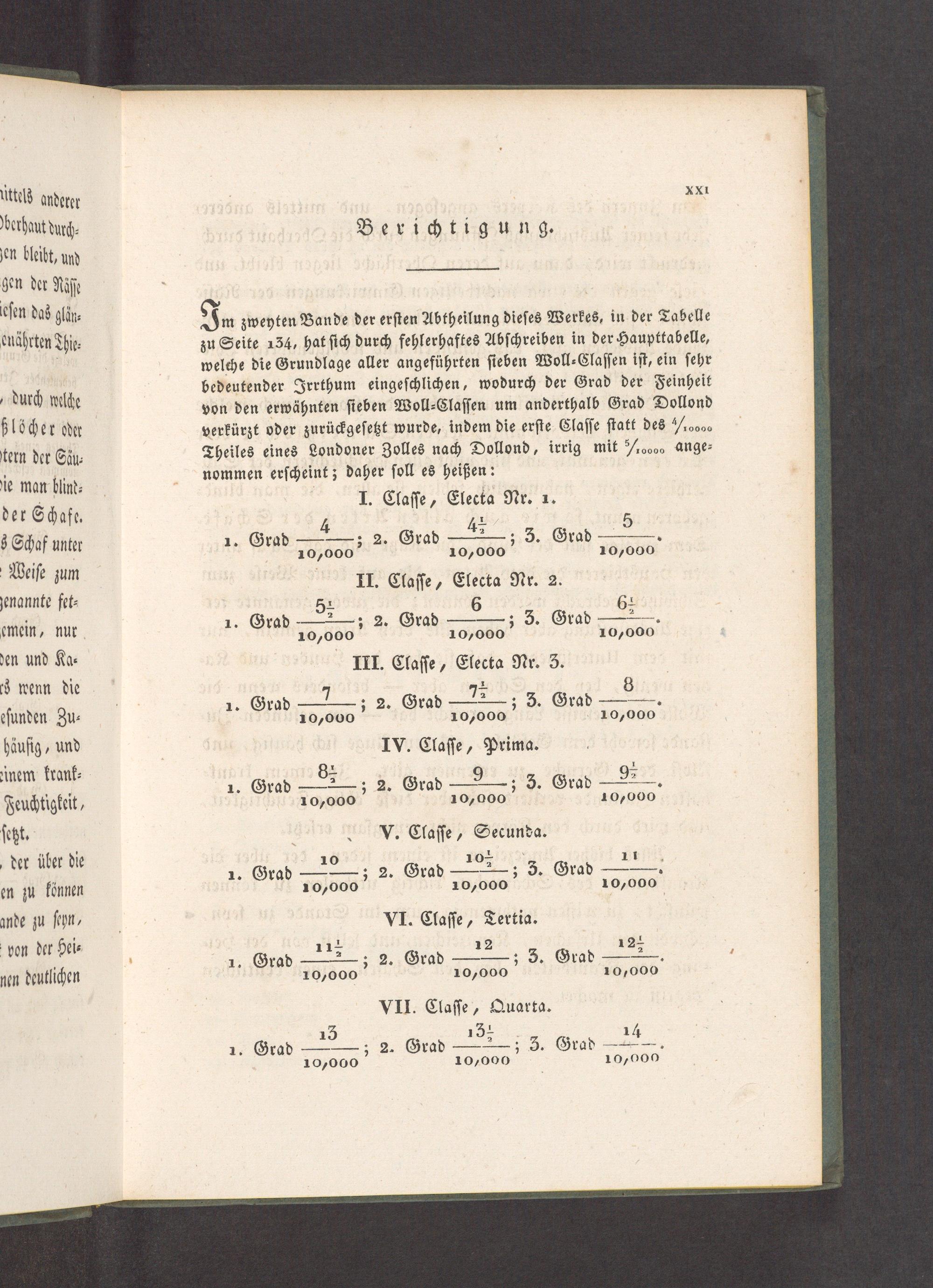 Im zweyten Bande der erſten Abtheilung dieſes Werkes, in der Tabelle zu Seite 134, hat ſich durch fehlerhaftes Abſchreiben in der Haupttabelle, welche die Grundlage aller angeführten ſieben Woll⸗Claſſen iſt, ein ſehr bedeutender Irrthum eingeſchlichen, wodurch der Grad der Feinheit von den erwähnten ſieben Woll⸗Claſſen um anderthalb Grad Dollond verkürzt oder zurückgeſetzt wurde, indem die erſte Claſſe ſtatt des οοo Theiles eines Londoner Zolles nach Dollond, irrig mit 1ooo ange⸗ nommen erſcheint; daher ſoll es heißen: I. Claſſe, Electa Nr. 1. 4 ⅓