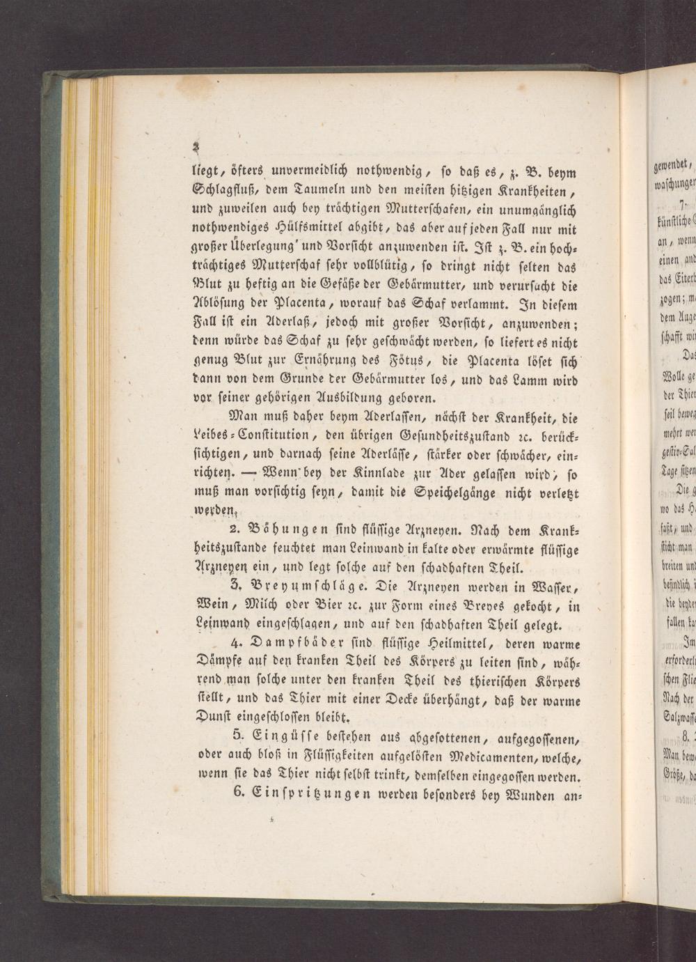 5. Eingüſſe beſtehen aus abgeſottenen, aufgegoſſenen, oder auch bloß in Flüſſigkeiten aufgelöſten Medicamenten, welche, wenn ſie das Thier nicht ſelbſt trinkt, demſelben eingegoſſen werden.