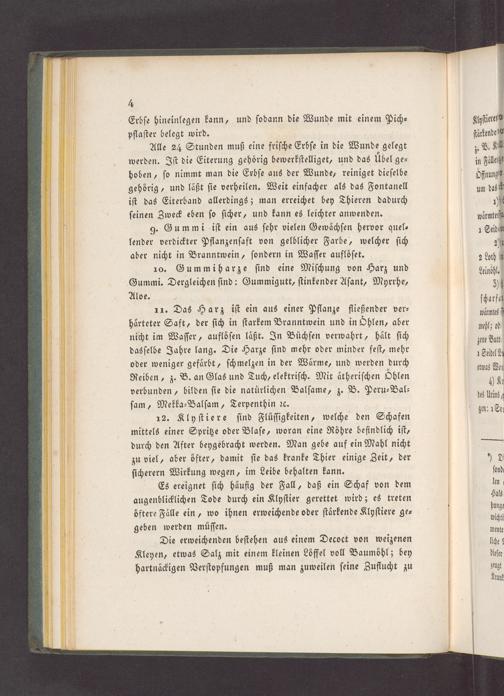 12. Klyſtiere ſind Flüſſigkeiten, welche den Schafen mittels einer Spritze oder Blaſe, woran eine Röhre bejindlich iſt, durch den After beygebracht werden. Man gebe auf ein Mahl nicht zu viel, aber öfter, damit ſie das kranke Thier einige Zeit, der ſicherern Wirkung wegen, im Leibe behalten kann.