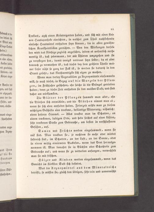 Die Blätter der Pflanzen ſammelt man aber, ehe die Blüthen ſich entwickeln; und die Blüthen nimmt man ab, wenn ſie ſich eben entfaltet haben. Jederzeit wähle man zu dieſem wichtigen Geſchäfte eine trockene, beſtändige Witterung, nähmlich: einen heitern Himmel.— Alles trockne man im Schatten, an einem trockenen, luftigen Orte, und hebe ſolches auf einer kühlen, ſehr trockenen Stelle zum Gebrauche, am beſten in verſchloſſenen Gefäßen, auf.