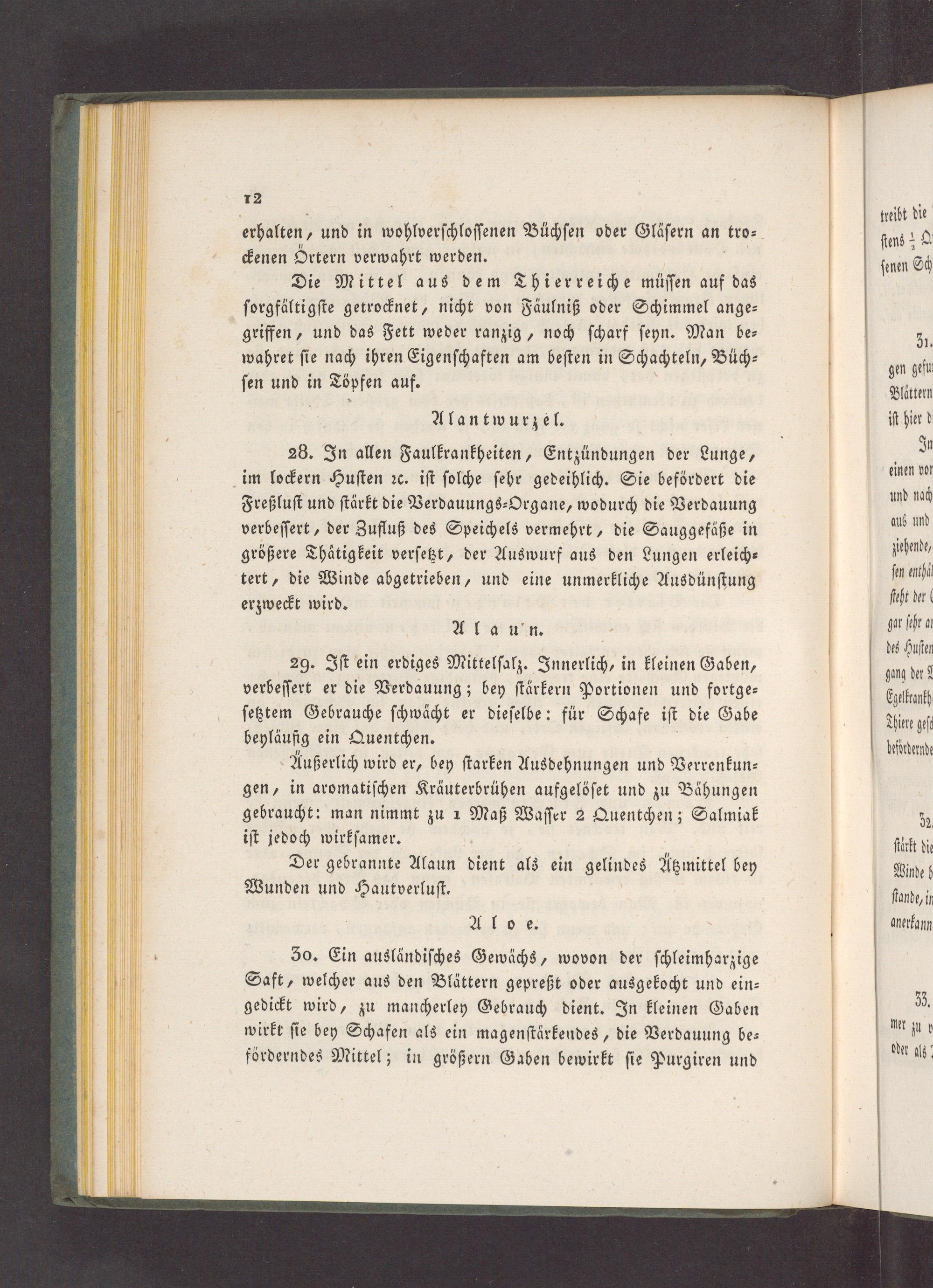30. Ein ausländiſches Gewächs, wovon der ſchleimharzige Saft, welcher aus den Blättern gepreßt oder ausgekocht und ein— gedickt wird, zu mancherley Gebrauch dient. In kleinen Gaben wirkt ſie bey Schafen als ein magenſtärkendes, die Verdauung be⸗ förderndes Mittel; in größern Gaben bewirkt ſie Purgiren und