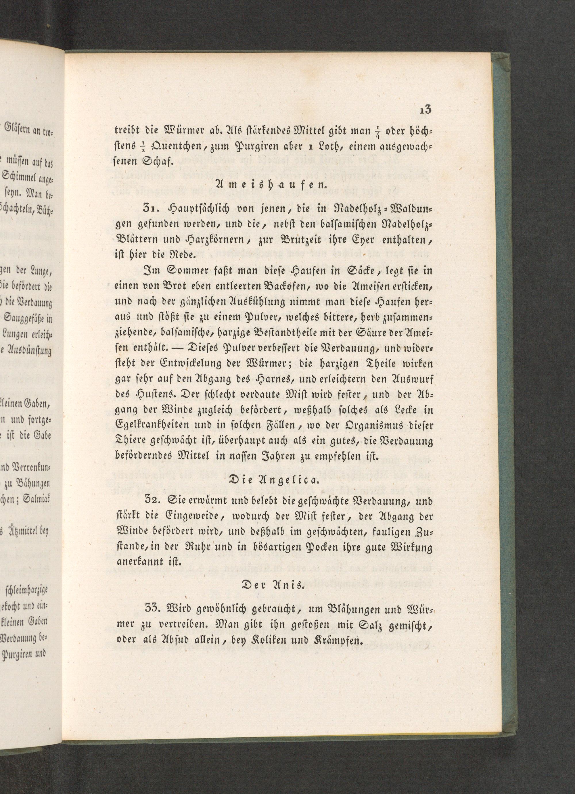 Im Sommer faßt man dieſe Haufen in Säcke, legt ſie in einen von Brot eben entleerten Backofen, wo die Ameiſen erſticken, und nach der gänzlichen Auskühlung nimmt man dieſe Haufen her⸗ aus und ſtößt ſie zu einem Pulver, welches bittere, herb zuſammen— ziehende, balſamiſche, harzige Beſtandtheile mit der Säure der Amei⸗ ſen enthält.— Dieſes Pulver verbeſſert die Verdauung, und wider⸗ ſteht der Entwickelung der Würmer; die harzigen Theile wirken gar ſehr auf den Abgang des Harnes, und erleichtern den Auswurf des Huſtens. Der ſchlecht verdaute Miſt wird feſter, und der Ab— gang der Winde zugleich befördert, weßhalb ſolches als Lecke in Egelkrankheiten und in ſolchen Fällen, wo der Organismus dieſer Thiere geſchwächt iſt, überhaupt auch als ein gutes, die Verdauung beförderndes Mittel in naſſen Jahren zu empfehlen iſt.
