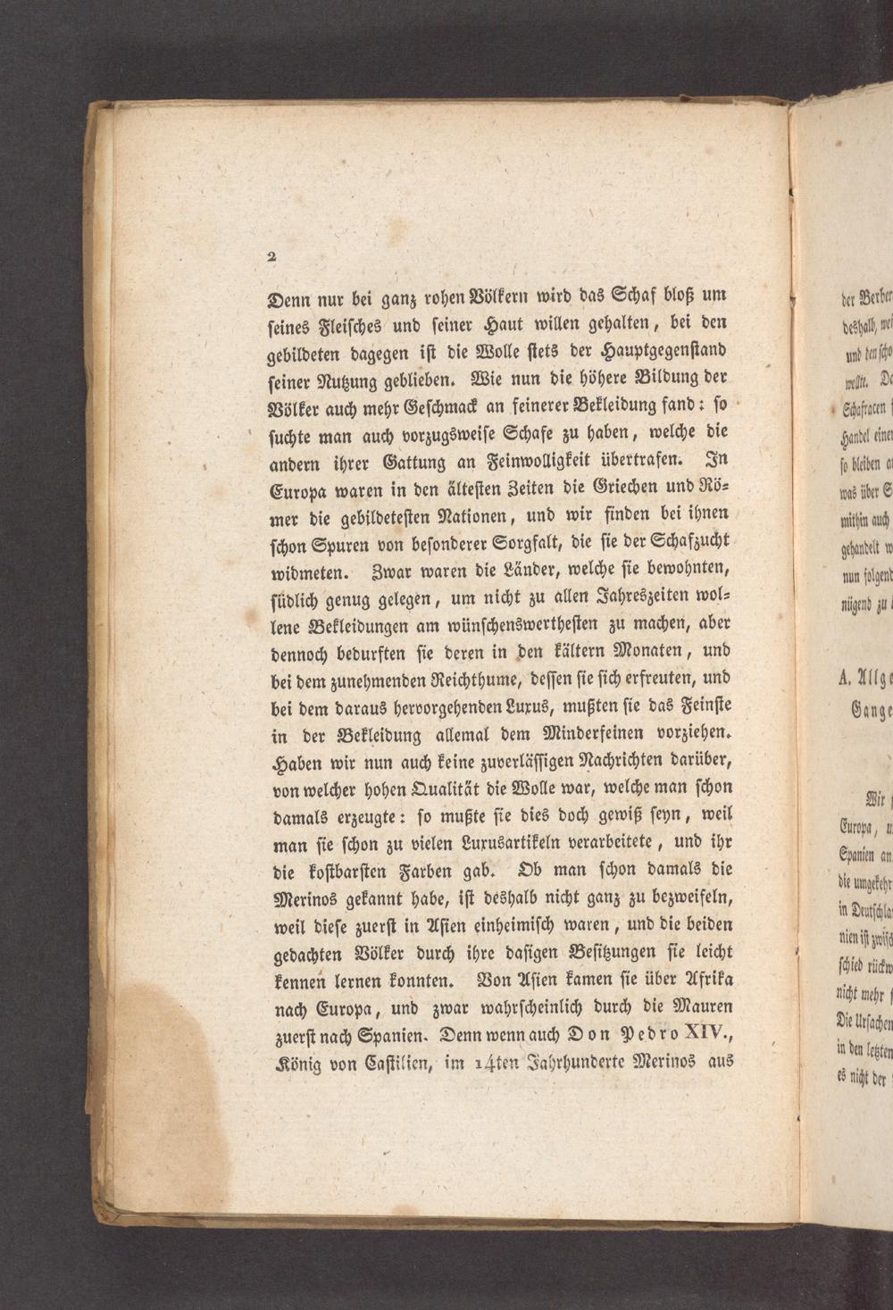 Denn nur bei ganz rohen Völkern wird das Schaf bloß um ſeines Fleiſches und ſeiner Haut willen gehalten, bei den gebildeten dagegen iſt die Wolle ſtets der Hauptgegenſtand ſeiner Nutzung geblieben. Wie nun die höhere Bildung der Völker auch mehr Geſchmack an feinerer Bekleidung fand: ſo ſuchte man auch vorzugsweiſe Schafe zu haben, welche die andern ihrer Gattung an Feinwolligkeit übertrafen. In Europa waren in den älteſten Zeiten die Griechen und Rö⸗ mer die gebildeteſten Nationen, und wir finden bei ihnen ſchon Spuren von beſonderer Sorgfalt, die ſie der Schafzucht widmeten. Zwar waren die Länder, welche ſie bewohnten, ſüdlich genug gelegen, um nicht zu allen Jahreszeiten wol⸗ lene Bekleidungen am wünſchenswertheſten zu machen, aber dennoch bedurften ſie deren in den kältern Monaten, und bei dem zunehmenden Reichthume, deſſen ſie ſich erfreuten, und bei dem daraus hervorgehenden Luxus, mußten ſie das Feinſte in der Bekleidung allemal dem Minderfeinen vorziehen. Haben wir nun auch keine zuverläſſigen Nachrichten darüber, von welcher hohen Qualität die Wolle war, welche man ſchon damals erzeugte: ſo mußte ſie dies doch gewiß ſeyn, weil man ſie ſchon zu vielen Lurusartikeln verarbeitete, und ihr die koſtbarſten Farben gab. Ob man ſchon damals die Merinos gekannt habe, iſt deshalb nicht ganz zu bezweifeln, weil dieſe zuerſt in Aſien einheimiſch waren, und die beiden gedachten Völker durch ihre daſigen Beſitzungen ſie leicht kennen lernen konnten. Von Aſien kamen ſie über Afrika nach Europa, und zwar wahrſcheinlich durch die Mauren zuerſt nach Spanien. Denn wenn auch Don Pedro XIV., König von Caſtilien, im 14ten Jahrhunderte Merinos aus