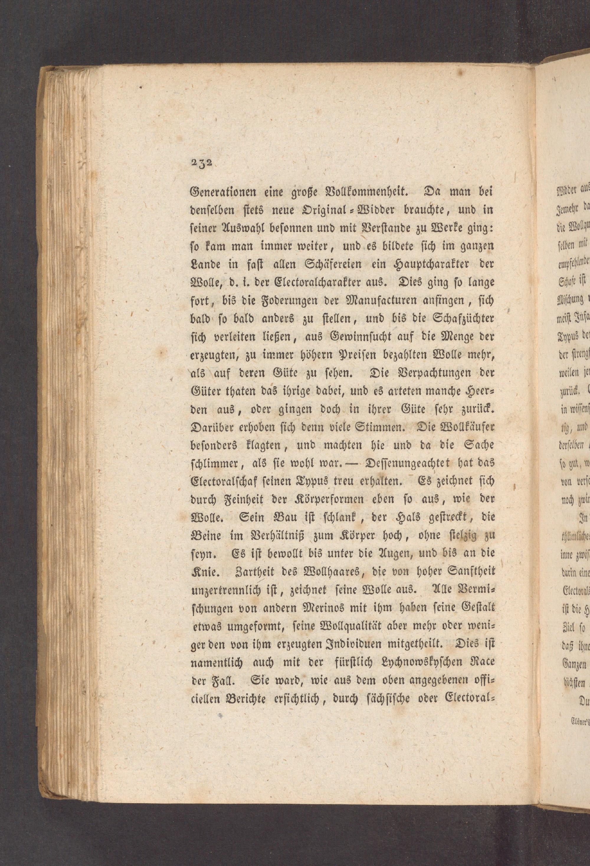 Generationen eine große Vollkommenheit. Da man bei denſelben ſtets neue Original-Widder brauchte, und in ſeiner Auswahl beſonnen und mit Verſtande zu Werke ging: ſo kam man immer weiter, und es bildete ſich im ganzen Lande in faſt allen Schäfereien ein Hauptcharakter der Wolle, d. i. der Electoralcharakter aus. Dies ging ſo lange fort, bis die Foderungen der Manufacturen anfingen, ſich bald ſo bald anders zu ſtellen, und bis die Schafzüchter ſich verleiten ließen, aus Gewinnſucht auf die Menge der erzeugten, zu immer höhern Preiſen bezahlten Wolle mehr, als auf deren Güte zu ſehen. Die Verpachtungen der Güter thaten das ihrige dabei, und es arteten manche Heer⸗ den aus, oder gingen doch in ihrer Güte ſehr zurück. Darüber erhoben ſich denn viele Stimmen. Die Wollkäufer beſonders klagten, und machten hie und da die Sache ſchlimmer, als ſie wohl war.— Deſſenungeachtet hat das Electoralſchaf ſeinen Typus treu erhalten. Es zeichnet ſich durch Feinheit der Körperformen eben ſo aus, wie der Wolle. Sein Bau iſt ſchlank, der Hals geſtreckt, die Beine im Verhältniß zum Körper hoch, ohne ſtelzig zu ſeyn. Es iſt bewollt bis unter die Augen, und bis an die Knie. Zartheit des Wollhaares, die von hoher Sanftheit unzertrennlich iſt, zeichnet ſeine Wolle aus. Alle Vermi⸗ ſchungen von andern Merinos mit ihm haben ſeine Geſtalt etwas umgeformt, ſeine Wollqualität aber mehr oder weni⸗ ger den von ihm erzeugten Individuen mitgetheilt. Dies iſt namentlich auch mit der fürſtlich Lychnowskyſchen Race der Fall. Sie ward, wie aus dem oben angegebenen offi⸗ ciellen Berichte erſichtlich, durch ſächſiſche oder Electoral⸗