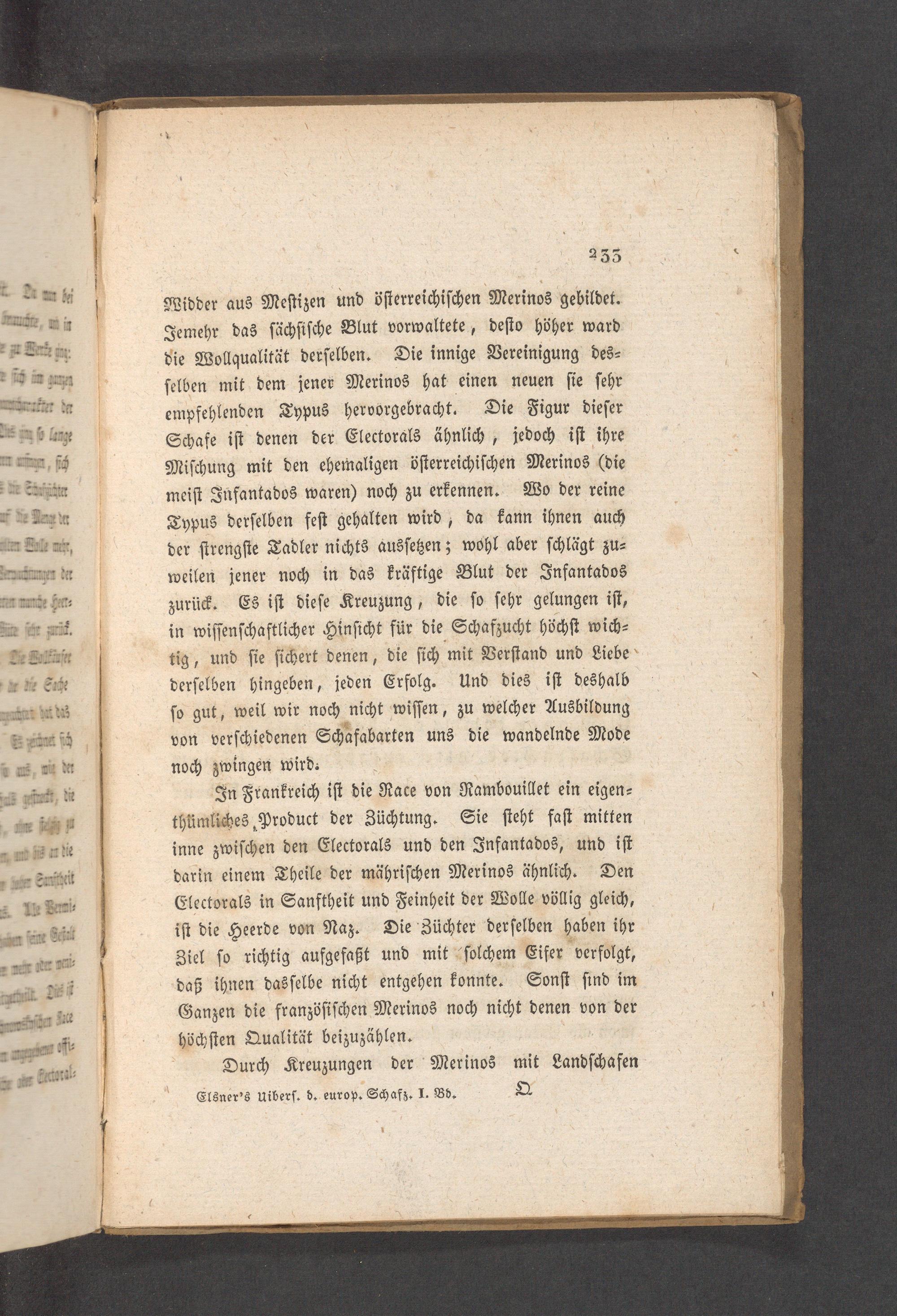 In Frankreich iſt die Race von Ramboulllet ein eigen⸗ thümliches Product der Züchtung. Sie ſteht faſt mitten inne zwiſchen den Electorals und den Infantados, und iſt darin einem Theile der mähriſchen Merinos ähnlich. Den Electorals in Sanftheit und Feinheit der Wolle völlig gleich, iſt die Heerde von Naz. Die Züchter derſelben haben ihr Ziel ſo richtig aufgefaßt und mit ſolchem Eifer verfolgt, daß ihnen dasſelbe nicht entgehen konnte. Sonſt ſind im Ganzen die franzöſiſchen Merinos noch nicht denen von der höchſten Qualität beizuzählen.