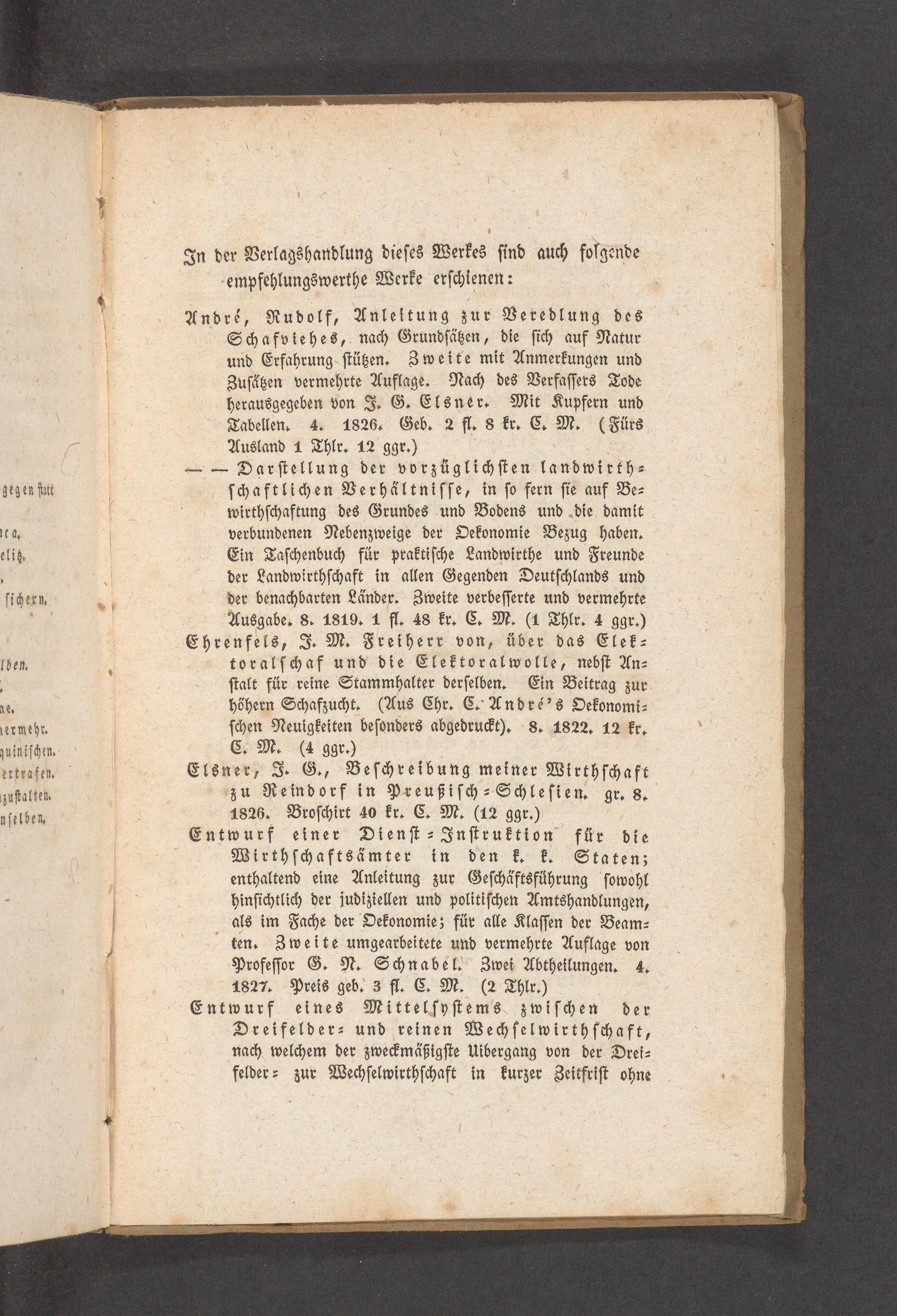 André, Rudolf, Anleitung zur Veredlung des Schafviehes, nach Grundſätzen, die ſich auf Natur und Erfahrung ſtützen. Zweite mit Anmerkungen und Zuſätzen vermehrte Auflage. Nach des Verfaſſers Tode herausgegeben von J. G. Elsner. Mit Kupfern und Tabellen. 4. 1826. Geb. 2 fl. 8 kr. C. M.(Fürs Ausland 1 Thlr. 12 ggr.)