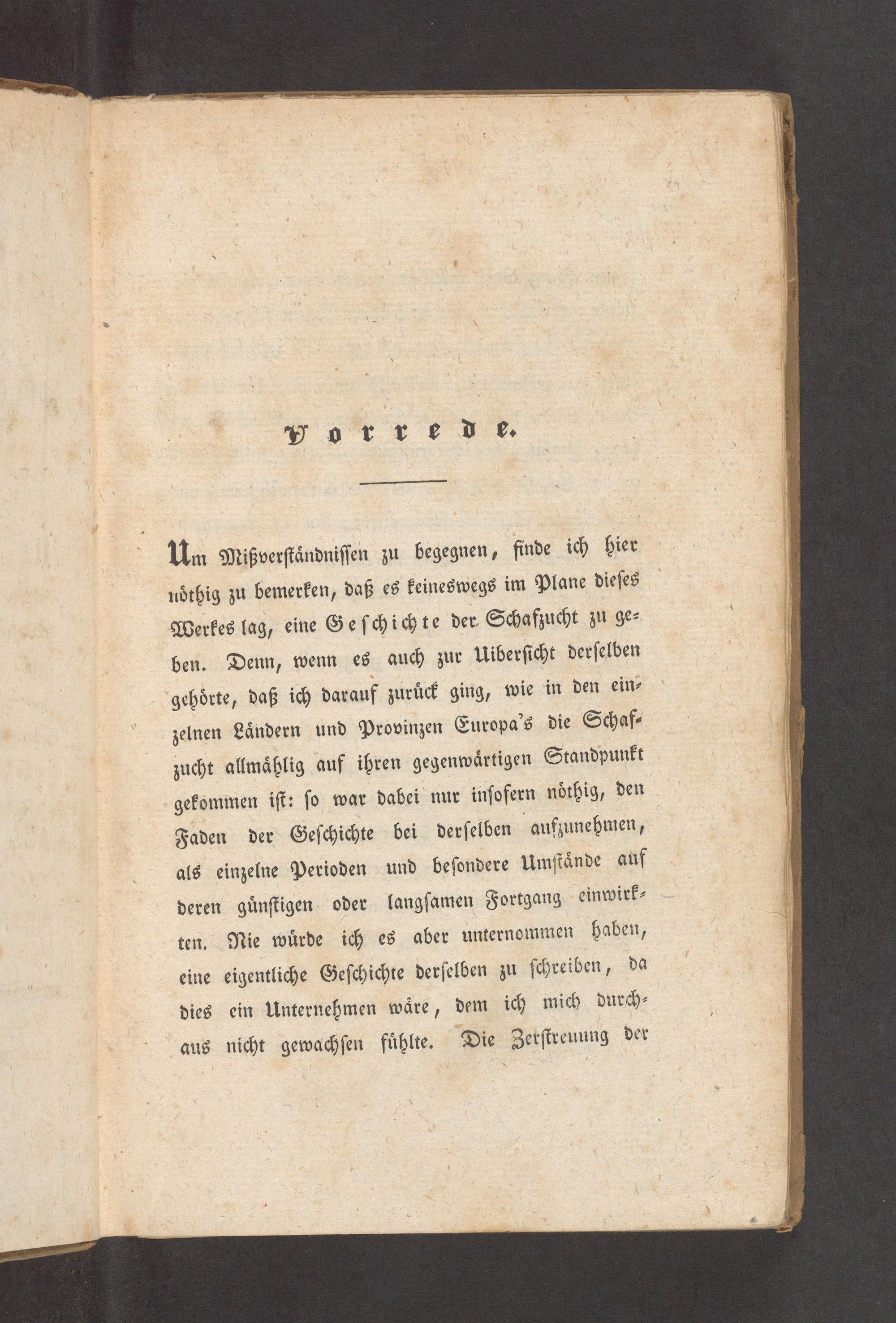 Um Mißverſtaͤndniſſen zu begegnen, finde ich hier noͤthig zu bemerken, daß es keineswegs im Plane dieſes Werkes lag, eine Geſchichte der⸗ Schafzucht zu ge⸗ ben. Denn, wenn es auch zur Uiberſicht derſelben gehoͤrte, daß ich darauf zuruͤck ging, wie in den ein⸗ zelnen Laͤndern und Provinzen Europa's die Schaf⸗ zucht allmaͤhlig auf ihren gegenwaͤrtigen Standpunkt gekommen iſt: ſo war dabei nur inſofern noͤthig, den Faden der Geſchichte bei derſelben aufzunehmen, als einzelne Perioden und beſondere Umſtaͤnde auf deren guͤnſtigen oder langſamen Fortgang einwirk⸗ ten. Nie wuͤrde ich es aber unternommen haben, eine eigentliche Geſchichte derſelben zu ſchreiben, da dies ein Unternehmen waͤre, dem ich mich durch⸗ aus nicht gewachſen fuͤhlte. Die Zerſtreuung der