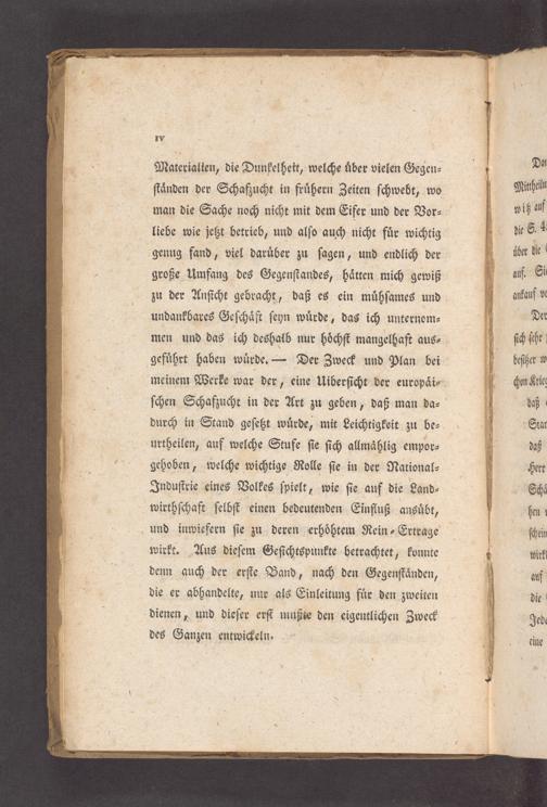 Materialien, die Dunkelheit, welche uͤber vielen Gegen⸗ ſtaͤnden der Schaßzucht in fruͤhern Zeiten ſchwebt, wo man die Sache noch nicht mit dem Eifer und der Vor⸗ liebe wie jetzt betrieb, und alſo auch nicht fuͤr wichtig genug fand, viel daruͤber zu ſagen, und endlich der große Umfang des Gegenſtandes, haͤtten mich gewiß zu der Anſicht gebracht, daß es ein muͤhſames und undankbares Geſchaͤft ſeyn wuͤrde, das ich unternom⸗ men und das ich deshalb nur hoͤchſt mangelhaft aus⸗ gefuͤhrt haben wuͤrde.— Der Zweck und Plan bei meinem Werke war der, eine Uiberſicht der europaͤi⸗ ſchen Schafzucht in der Art zu geben, daß man da⸗ durch in Stand geſetzt wuͤrde, mit Leichtigkeit zu be⸗ urtheilen, auf welche Stufe ſie ſich allmaͤhlig empor⸗ gehoben, welche wichtige Rolle ſie in der National⸗ Induſtrie eines Volkes ſpielt, wie ſie auf die Land⸗ wirthſchaft ſelbſt einen bedeutenden Einfluß ansuͤbt, und inwiefern ſie zu deren erhoͤhtem Rein⸗Ertrage wirkt. Aus dieſem Geſichtspunkte betrachtet, konnte denn auch der erſte Band, nach den Gegenſtaͤnden, die er abhandelte, nur als Einleitung fuͤr den zweiten dienen, und dieſer erſt mußte den eigentlichen Zweck des Ganzen entwickeln.
