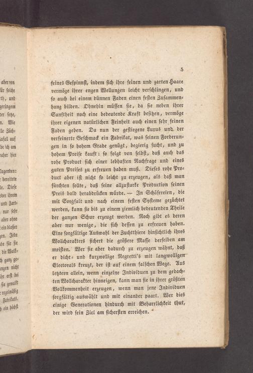feines Geſpinnſt, indem ſich ihre feinen und zarten Haare vermöge ihrer engen Wellungen leicht verſchlingen, und ſo auch bei einem dünnen Faden einen feſten Zuſammen⸗ hang bilden. Ohnehin müſſen ſie, da ſie neben ihrer Sanftheit noch eine bedeutende Kraft beſitzen, vermöge ihrer eigenen natürlichen Feinheit auch einen ſehr feinen Faden geben. Da nun der geſtiegene Luxus und der verfeinerte Geſchmack ein Fabrikat, was ſeinen Forderun⸗ gen in ſo hohem Grade genügt, begierig ſucht, und zu hohem Preiſe kauft: ſo folgt von ſelbſt, daß auch das rohe Product ſich einer lebhaften Nachfrage und eines guten Preiſes zu erfreuen haben muß. Dieſes rohe Pro⸗ duct aber iſt nicht ſo leicht zu erzeugen, als daß man fürchten ſollte, daß ſeine allzuſtarke Production ſeinen Preis bald herabdrücken würde.— In Schäfereien, die mit Sorgfalt und nach einem feſten Syſteme gezüchtet werden, kann ſie bis zu einem ziemlich bedeutenden Theile der ganzen Schur erzeugt werden. Noch gibt es deren aber nur wenige, die ſich deſſen zu erfreuen haben. Eine ſorgfältige Auswahl der Zuchtthiere hinſichtlich ihres Wollcharakters ſichert die größere Maſſe derſelben am meiſten. Wer ſie aber dadurch zu erzeugen wähnt, daß er dicht- und kurzwollige Negretti's mit langwolligen Electorals kreuzt, der iſt auf einem falſchen Wege. Aus letztern allein, wenn einzelne Individuen zu dem gedach⸗ ten Wollcharakter hinneigen, kann man ſie in ihrer größten Vollkommenheit erzeugen, wenn man jene Individuen ſorgfältig auswählt und mit einander paart. Wer dies einige Generationen hindurch mit Beharrlichkeit thut, der wird ſein Ziel am ſicherſten erreichen.