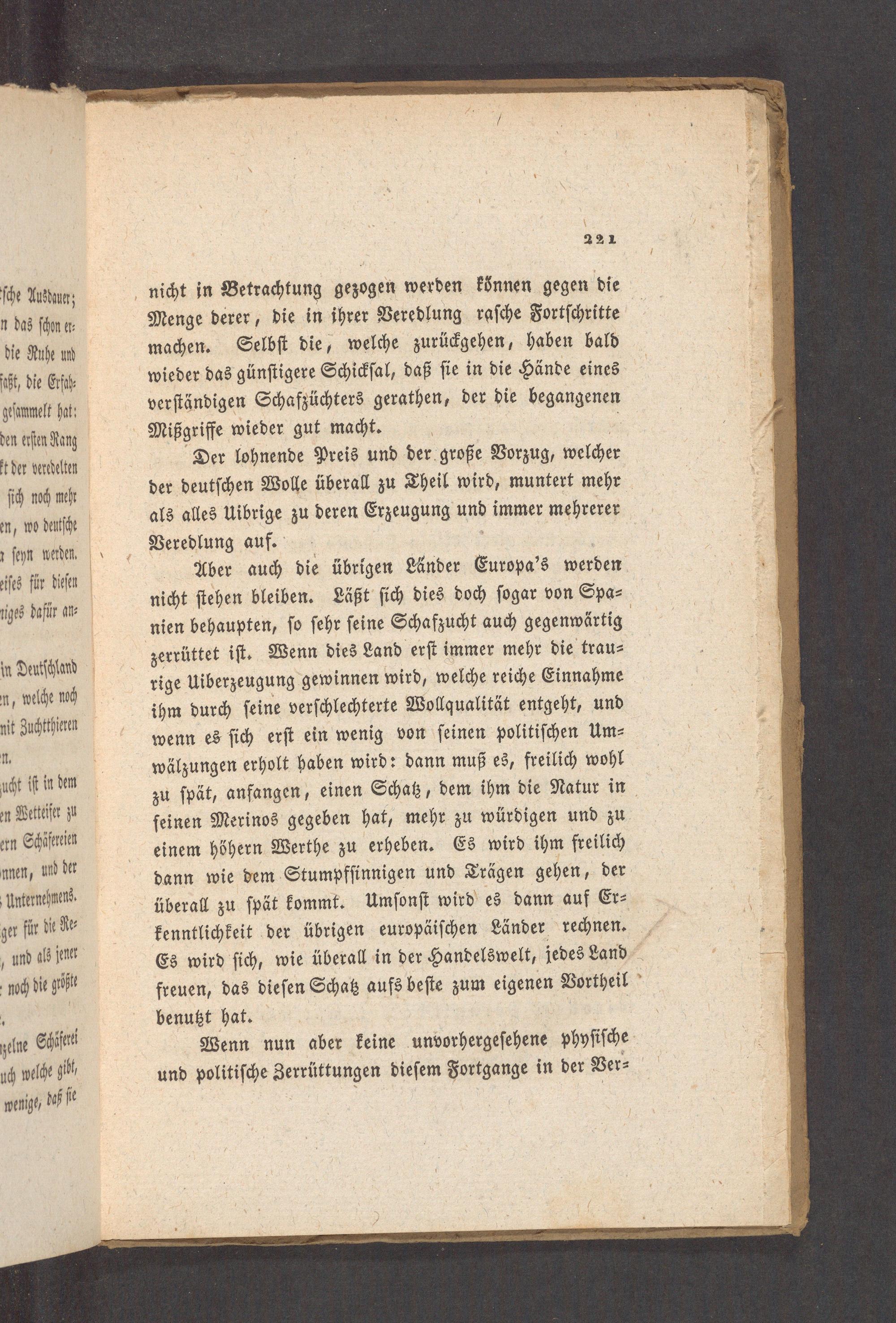 Aber auch die übrigen Länder Europa's werden nicht ſtehen bleiben. Läßt ſich dies doch ſogar von Spa⸗ nien behaupten, ſo ſehr ſeine Schafzucht auch gegenwärtig zerrüttet iſt. Wenn dies Land erſt immer mehr die trau⸗ rige Uiberzeugung gewinnen wird, welche reiche Einnahme ihm durch ſeine verſchlechterte Wollqualität entgeht, und wenn es ſich erſt ein wenig von ſeinen politiſchen Um⸗ wälzungen erholt haben wird: dann muß es, freilich wohl zu ſpät, anfangen, einen Schatz, dem ihm die Natur in ſeinen Merinos gegeben hat, mehr zu würdigen und zu einem höhern Werthe zu erheben. Es wird ihm freilich dann wie dem Stumpfſinnigen und Trägen gehen, der überall zu ſpät kommt. Umſonſt wird es dann auf Er⸗ kenntlichkeit der übrigen europäiſchen Länder rechnen. Es wird ſich, wie überall in der Handelswelt, jedes Land freuen, das dieſen Schatz aufs beſte zum eigenen Vortheil benutzt hat.