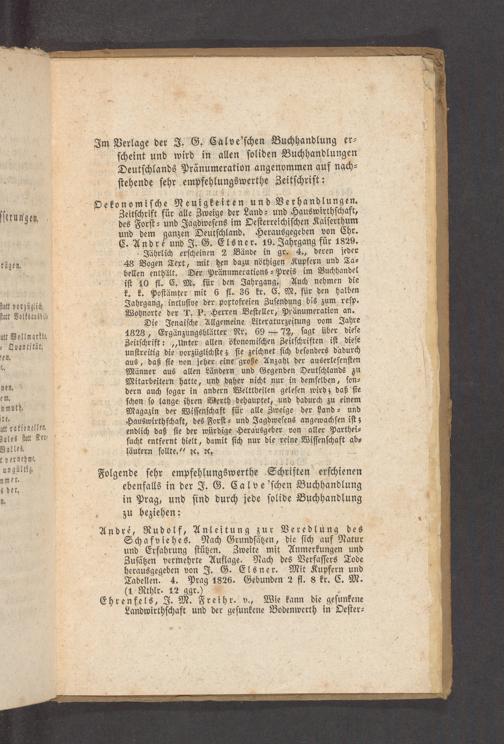 Schafviehes. Nach Grundſätzen, die ſich auf Natur und Erfahrung ſtützen. Zweite mit Anmerkungen und Zuſätzen vermehrte Auflage. Nach des Verfaſſers Tode herausgegeben von J. G. Elsner. Mit Kupfern und Tabellen. 4. Prag 1826. Gebunden 2 fl. 8 kr. C. M. (1 Rthlr. 12 ggr.)