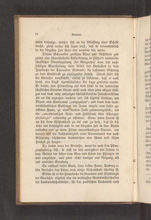 Dieſem Schwanken zwiſchen Thun und Nichtthun gab zuletzt eine ſchmeichelhafte Aufforderung in Fiſcher's landwirth⸗ ſchaftlicher Literaturzeitung(bei Gelegenheit einer ſehr nach⸗ ſichtigen Beurtheilung einer Arbeit des Verfaſſers in dem Jahrbuche der Tharander Akademie) die beſtimmte Richtung zu dem Entſchluſſe zu vorliegender Arbeit. Jedoch fuͤhlt ſich der Verfaſſer verpflichtet, ehrlich zu bekennen, daß er auch durch eine Angſt eigenthuͤmlicher Art dazu getrieben wurde. Er dachte, jene Hinweiſung auf dieſe Luͤcke in der landwirth⸗ ſchaftlichen Literatur koͤnnte wohl auch einer jener allezeit ferti⸗ gen und doch ewig unfertigen ſchriftſtellernden Induſtrie⸗Ritter als an ſich ergangen erachten und ſich ſogleich hinſetzen, um Meyen oder Treviranus„auszuziehen“, und dann dem land⸗ wirthſchaftlichen Publicum die Jenen einzeln vom Leibe ge⸗ riſſenen Fetzen, zu einer bunten Jacke zuſammengeflickt, als ein„unentbehrliches Noth⸗ und Huͤlfsbuch uͤber Pflanzen⸗ phyſiologie“ ruhmredig zu offeriren. Denn jenen Leuten iſt an ſich keine Wiſſenſchaft zu tief und zu hoch, daß ſie ſich nicht mit Leichtigkeit und in der kuͤrzeſten Zeit in ihre Tiefen verſenken und zu ihren Hoͤhen emporſchwingen koͤnnten, um daraus mit der Geſchwindigkeit eines Escamoteurs den nach Belehrung duͤrſtenden Landwirthen eine Wabe voll ſuͤßen Honigs zu ſaugen.