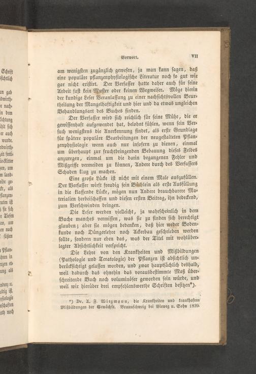 Die Lehre von den Krankheiten und Mißbildungen (Pathologie und Teratologie) der Pflanzen iſt abſichtlich un⸗ beruͤckſichtigt gelaſſen worden, und zwar hauptſaͤchlich deshalb, weil dadurch das ohnehin das vorausbeſtimmte Maß uͤber⸗ ſchreitende Buch noch voluminoͤſer geworden ſein wuͤrde, und weil wir hieruͤber drei empfehlenswerthe Schriften beſitzen“*).