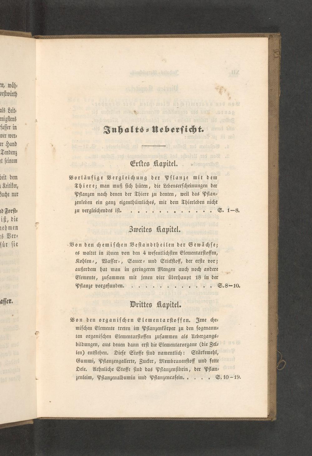 Bon den chemiſchen Beſtandtheilen der Gewächſe; es waltet in ihnen von den 4 weſentlichſten Elementarſtoffen, Kohlen⸗, Waſſer⸗, Sauer⸗ und Stickſtoff, der erſte vor; außerdem hat man in geringeren Mengen auch noch andere Elemente, zuſammen mit jenen vier überhaupt 18 in der Pflanze vorgefundennn//..S. 8— 10.