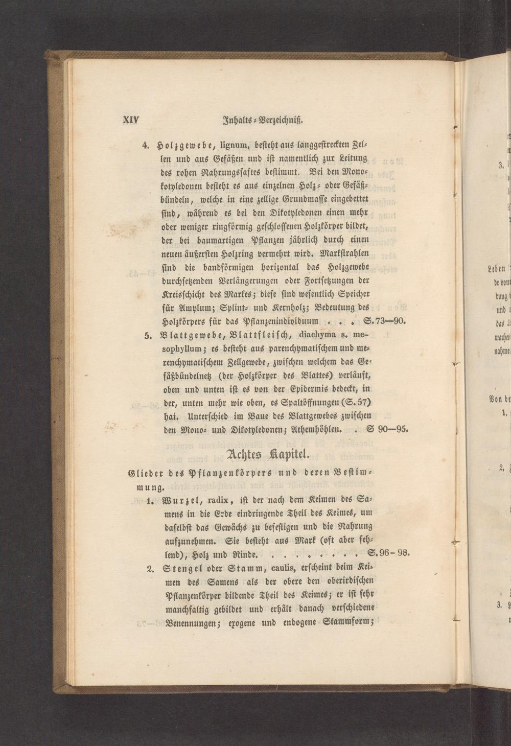 4. Holzgewebe, lignum, beſteht aus langgeſtreckten Zel⸗ len und aus Gefäßen und iſt namentlich zur Leitung des rohen Nahrungsſaftes beſtimmt. Bei den Mono⸗ kotyledonen beſteht es aus einzelnen Holz⸗ oder Gefäß⸗ bündeln, welche in eine zellige Grundmaſſe eingebettet ſind, während es bei den Dikotyledonen einen mehr oder weniger ringförmig geſchloſſenen Holzkörper bildet, der bei baumartigen Pflanzen jährlich durch einen neuen äußerſten Holzring vermehrt wird. Markſtrahlen ſind die bandförmigen horizontal das Holzgewebe durchſetzenden Verlängerungen oder Fortſetzungen der Kreisſchicht des Markes; dieſe ſind weſentlich Speicher für Amylum; Splint⸗ und Kernholz; Bedeutung des Holzkörpers für das Pflanzenindividuumm S. 73— 90.