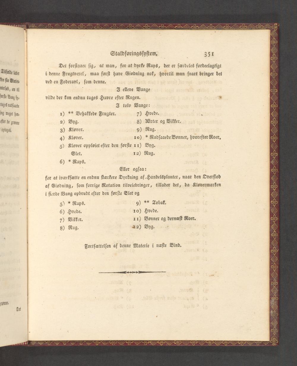 vilde der kun endnu tages Havre efter Rugen.* J tolv Vange: 1)** Behakkede Frugter. 7) Hvede.. 2) Byg. 8) WTrter og Vikker. 3) Klover. 9) Rug. 4) Klover. 10)* Radſaaede Bonner, hvorefter Roer. 5) Klover oppleiet efter den forſte 11) Byg. Slet. 12) Rug. 6)* Raps.