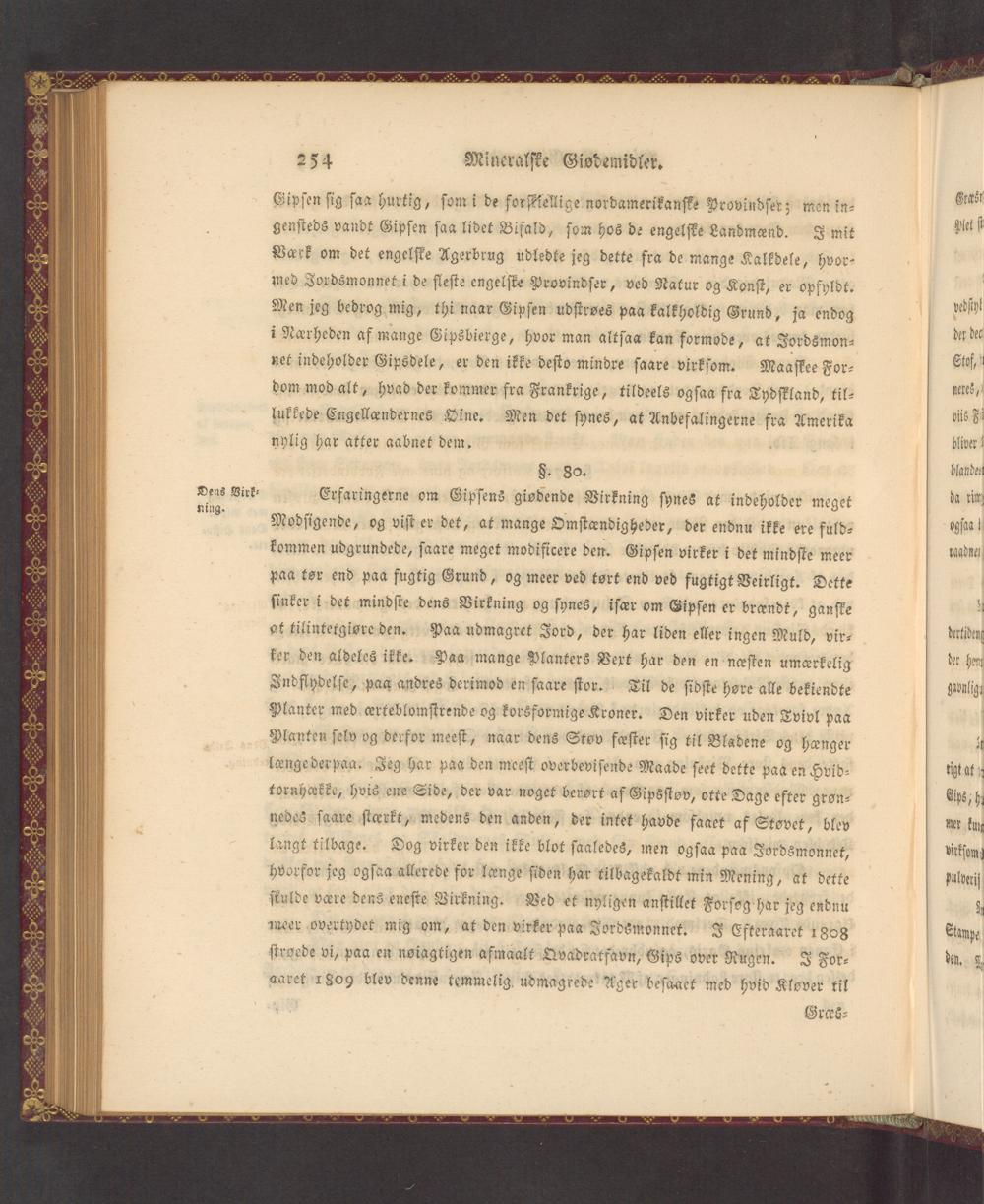 Erfaringerne om Gipſens giodende Virkning ſynes at indeholder meget Modſigende, og viſt er det, at mange Omſtandigheder, der endnu ikke ere fuld⸗ kommen udgrundede, ſaare meget modificere den. Gipſen virker i det mindſte meer paa tor end paa fugtig Grund, og meer ved tort end ved fugtigt Veirligt. Dette ſinker i det mindſte dens Virkning og ſynes, iſcr om Gipſen er brœndt, ganſke at tilintetgisre den. Paa udmagret Jord, der har liden eller ingen Muld, vir⸗ ker den aldeles ikke. Paa mange Planters Vext har den en naſten umerkelig Indflydelſe, paa andres derimod en ſaare ſtor. Til de ſidſte hore alle bekiendte Planter med crrteblomſtrende og korsformige Kroner. Den virker uden Tvivl paa Planten ſelv og derfor meeſt, naar dens Stov fafſter ſig til Bladene og haʒnger