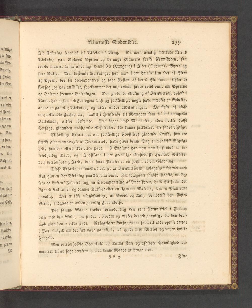 Tid Erfaring ledet os til Vitriolens Brug. Da man nemlig markede Iltens Virkning paa Sadens Spiren og de unge Planters forſte Fremſkyden, ſaa troede man at kunne anbringe denne Ilt(Oxygene) i Ilter(Oryder), Syrer og ſure Salte. Men beſtemte Virkninger har man i det hoieſte kun ſeet af Ilter og Syrer, der let decomponeres og lade Reſten af deres Ilt fare. Efter de Forſog jeg har anſtillet, forekommer det mig endnu ſaare tvivlſomt, om Syrerne og Saltene fremme Spirningen. Den giodende Virkning af Jernvitriol, oplsſt i Vand, har ogſaa ved Forſogene viiſt ſig forſtiellig; nogle have market en ſkadelig, andre en gaynlig Virkning, og atter andre aldeles ingen. De fleſte af disſe mig bekiendte Forſog ere, ſaavel i Henſeende til Mangden ſom til det befugtede Jordsmon, altfor ubeſtemte. Men begge disſe Momenter, uden hvilke disſe Forſogs, hinanden modſigende Reſultater, ikke kunne forklares, ere ſaare vigtige.