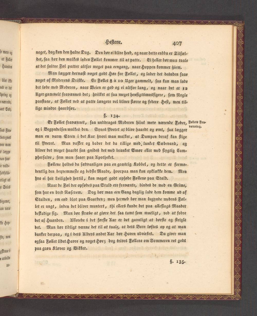 Man lagger dernaſt noget godt Hoe for Follet, og lader det desuden faae noget af Moderens Drikke. Er Follet 8 à 10 Uger gammelt, ſaa kan man lade det lobe med Moderen, naar Veien er god og ei altfor lang, og naar det er 12 Uger gammelt fravannes det; hvilket er ſaa meget henſigtsmasſigere, ſom Nogle paaſtaae, at Follet ved at patte langere vel bliver ſtorre og federe Heſt, men til⸗ lige mindre haardfor.