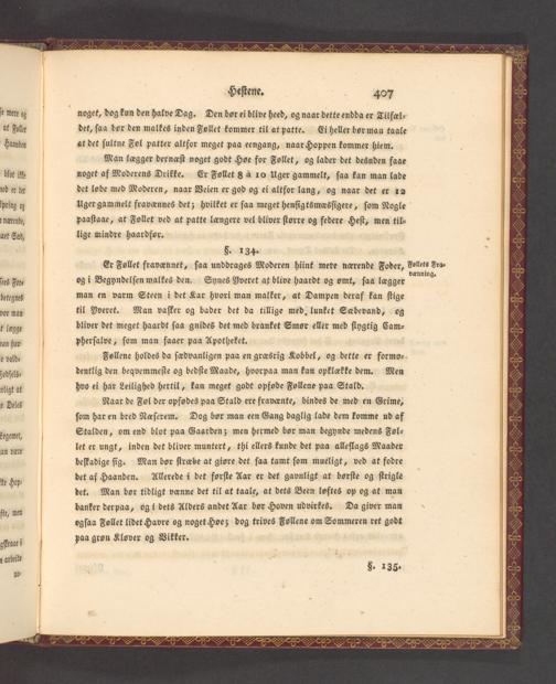 Naar de Fol der opfodes paa Stald ere fravcente, bindes de med en Grime, ſom har en bred Naſerem. Dog bor man een Gang daglig lade dem komme ud af Stalden, om end blot paa Gaarden; men hermed bor man begynde medens Fol⸗ let er ungt, inden det bliver muntert, thi ellers kunde det paa alleſlags Maader beſkadige ſig. Man bor ſtrœbe at giore det ſaa tamt ſom mueligt, ved at fodre det af Haanden. Allerede i det forſte Aar er det gavnligt at borſte og ſtrigle det. Man bor tidligt venne det til at taale, at dets Been loftes op og at man banker derpaa, ogi dets Alders andet Aar bor Hoven udvirkes. Da giver man ogſaa Follet lidet Havre og noget Hoe; dog trives Follene om Sommeren ret godt