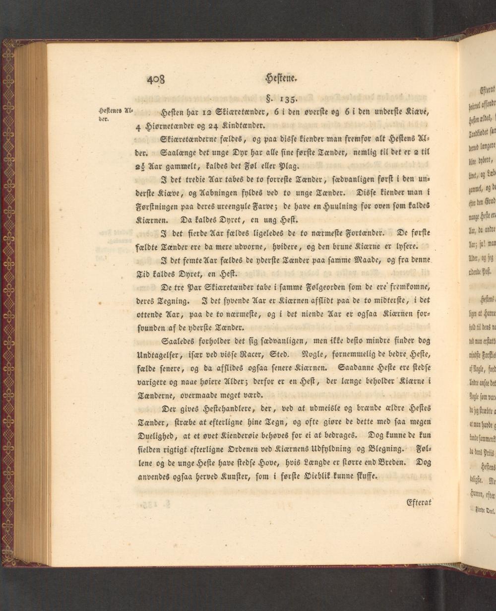 Skiceretanderne faldes, og paa disſe kiender man fremfor alt Heſtens Al⸗ der. Saalange det unge Dyr har alle ſine forſte Tœnder, nemlig til det er 2 til 2 ½ Aar gammelt, kaldes det Fol eller Plag.