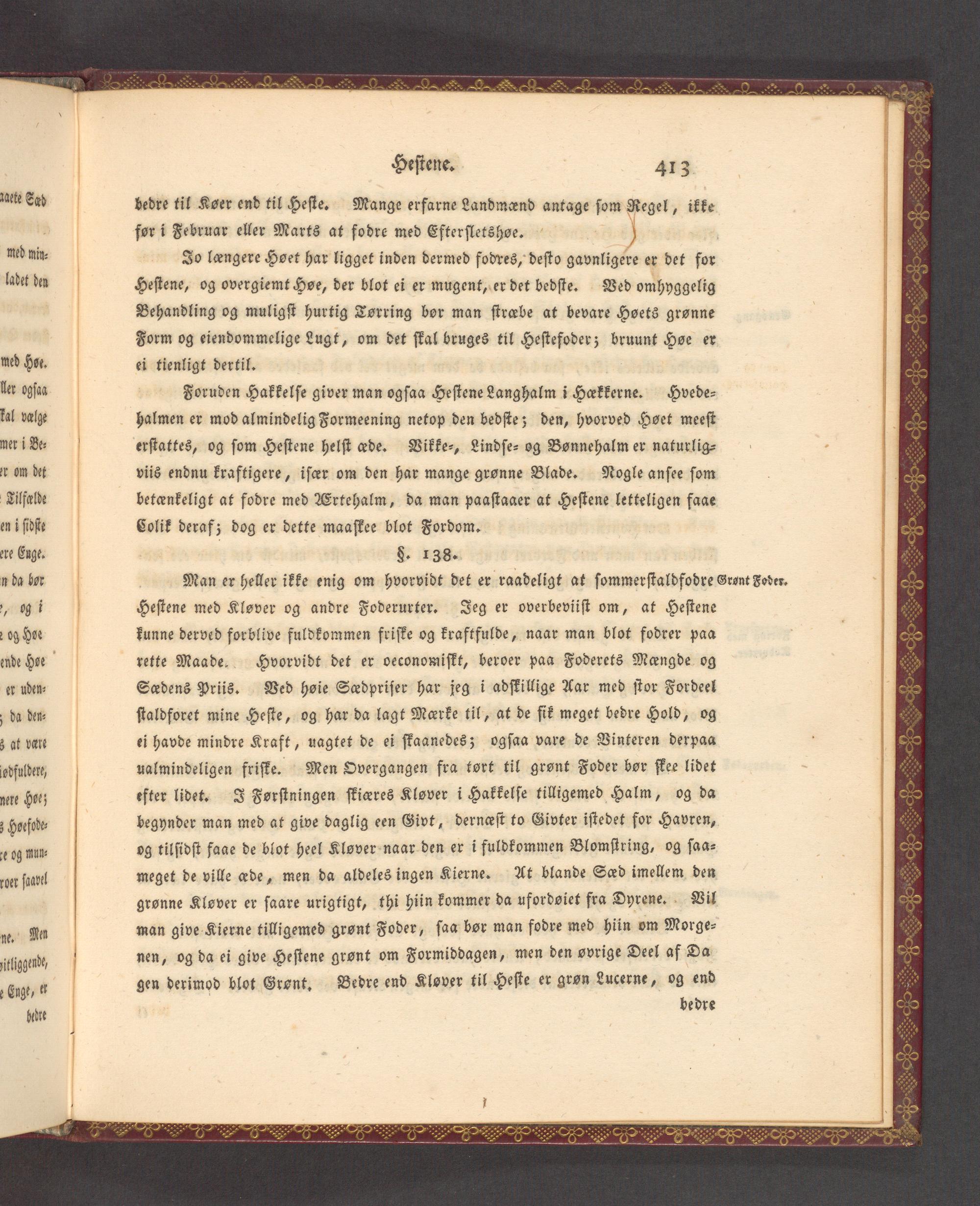 Heſtene med Klover og andre Foderurter. Jeg er overbeviiſt om, at Heſtene kunne derved forblive fuldkommen friſke og kraftfulde, naar man blot fodrer paa rette Maade. Hvorvidt det er oeconomiſkt, beroer paa Foderets Mengde og Sadens Priis. Ved hoie Sadpriſer har jeg i adſkillige Aar med ſtor Fordeel ſtaldforet mine Heſte, og har da lagt Marke til, at de ſik meget bedre Hold, og ei havde mindre Kraft, uagtet de ei ſkaanedes; ogſaa vare de Vinteren derpaa ualmindeligen friſfe. Men Overgangen fra tort til gront Foder bor ſkee lidet efter lidet. Forſtningen ſkicres Klover i Hakkelſe tilligemed Halm, og da begynder man med at give daglig een Givt, dernefſt to Givyter iſtedet for Havren, og tilſidſt faae de blot heel Klsver naar den er i fuldkommen Blomſtring, og ſaa⸗ meget de ville ade, men da aldeles ingen Kierne. At blande Sad imellem den gronne Klover er ſaare urigtigt, thi hiin kommer da ufordoiet fra Dyrene. Vil man give Kierne tilligemed gront Foder, ſaa bor man fodre med hiin om Morge⸗ nen, og da ei give Heſtene gront om Formiddagen, men den svrige Deel af Da