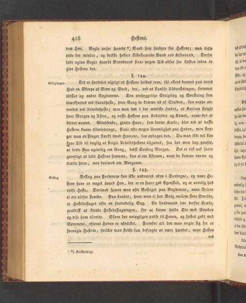 Beſlag paa Forbenene kan ikke undvores uden i Sandegne, og naar He⸗ ſtene have en meget haard Hov, der er en ſaare god Egenſkab, og er arvelig hos visſe Heſte. Derimod ſparer man ofte Beſlaget paa Bagbenene, naar Veiene ei ere altfor ſtenede. Paa Landet, hvor man ei har Valg mellem flere Smedde, er Heſtebeſlaget ofte en fortredelig Sag. praktiſk at kiende Heſtebeſlagningen, for at kunne holde Hie med Smeden Skoen bor noiagtigen pasſe til Hoven, og faſſtes godt med Fremfor alt bor man vogte ſig for at