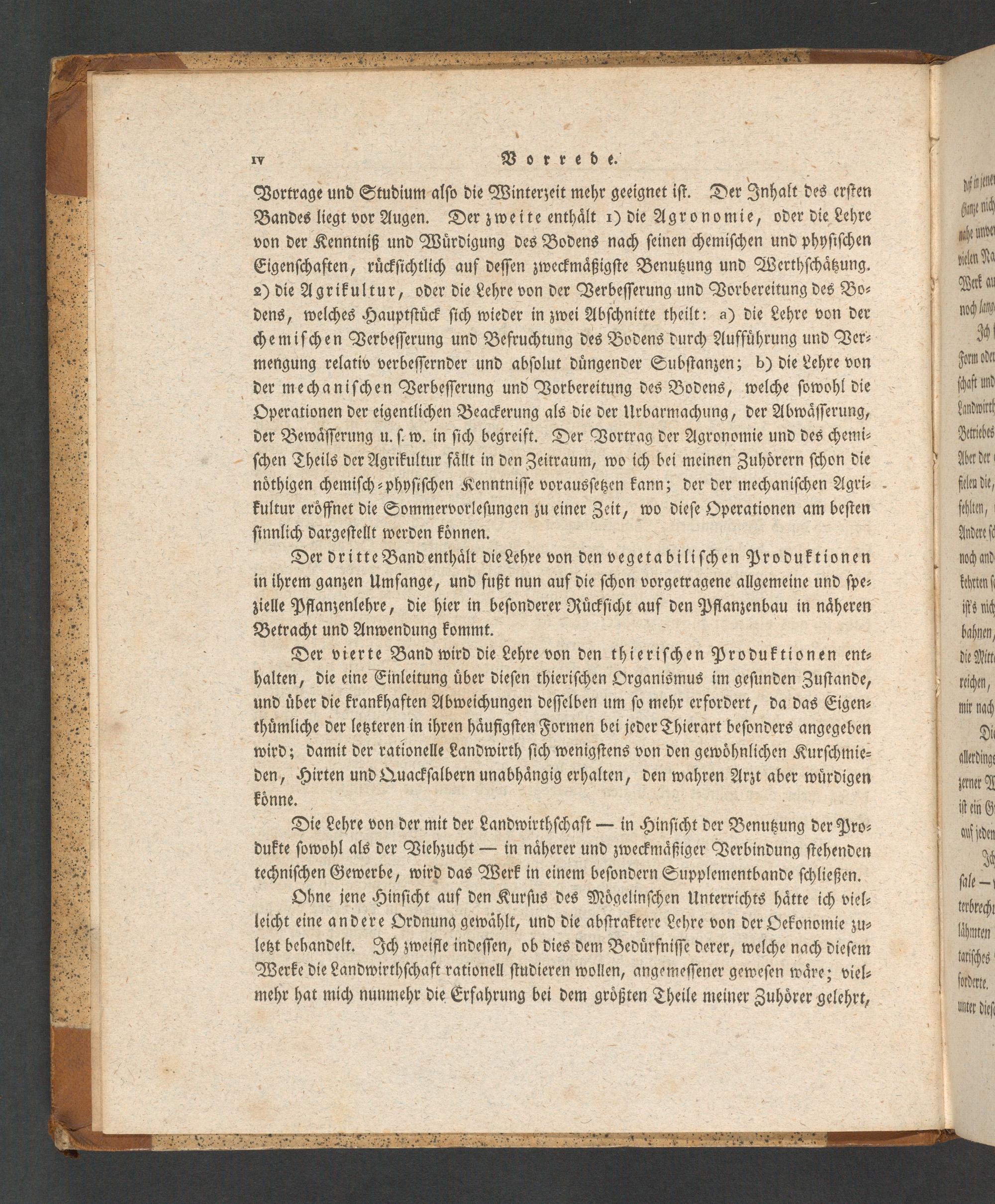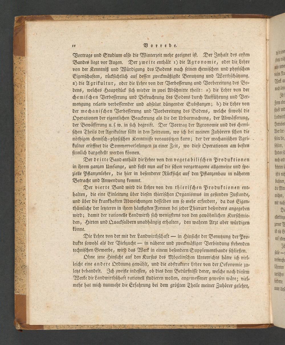 Der vierte Band wird die Lehre von den thieriſchen Produktionen ent⸗ halten, die eine Einleitung uͤber dieſen thieriſchen Organismus im geſunden Zuſtande, und uͤber die krankhaften Abweichungen deſſelben um ſo mehr erfordert, da das Eigen⸗ thuͤmliche der letztereni in ihren haͤufigſten Formen bei jeder Thierart beſonders angegeben wird; damit der rationelle Landwirth ſich wenigſtens von den gewoͤhnlichen Kurſchmie⸗ den, Hirten und Quackſalbern unabhaͤngig erhalten, den wahren Arzt aber wuͤrdigen koͤnne.