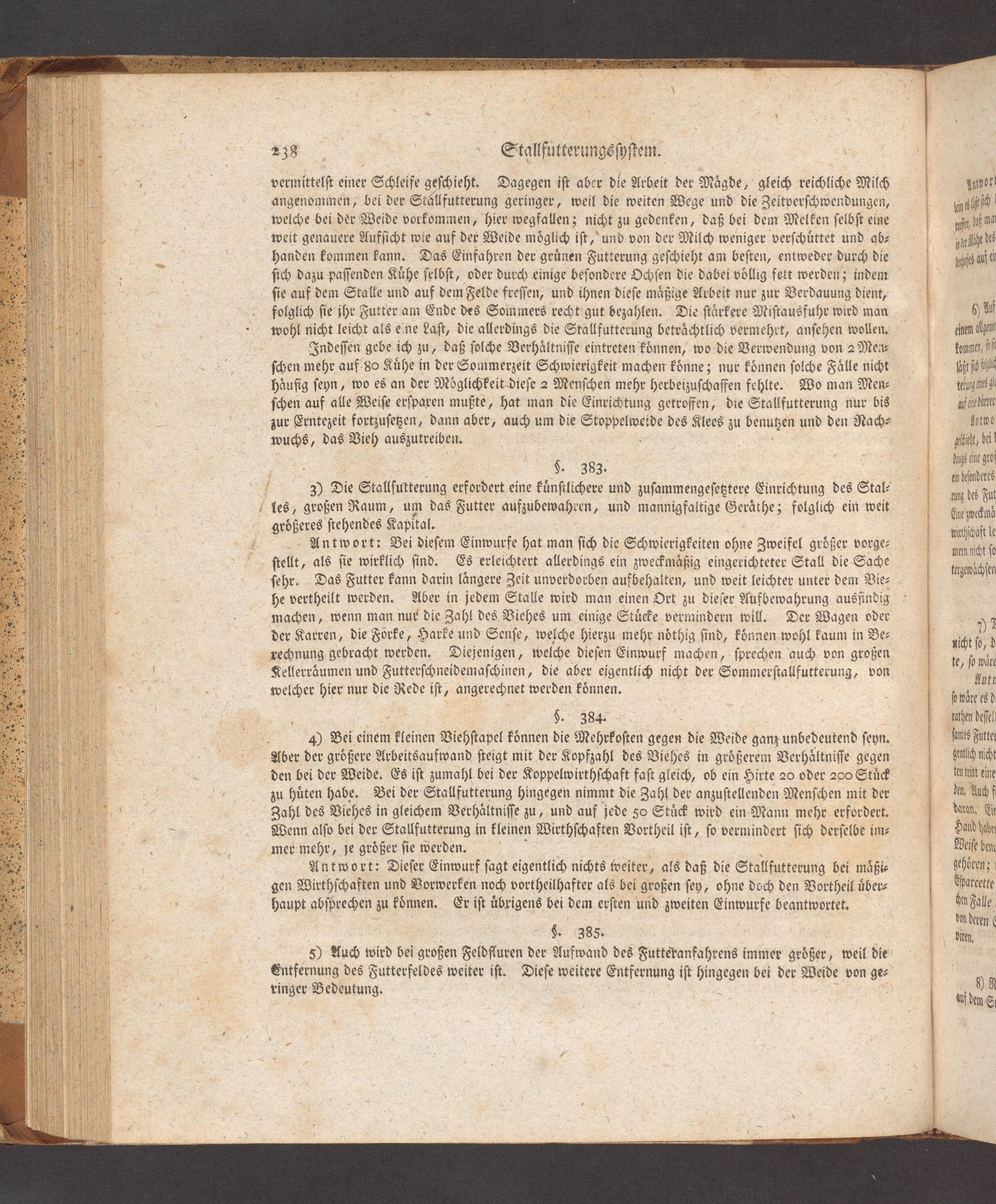 Antwort: Dieſer Einwurf ſagt eigentlich nichts weiter, als daß die Stallfutterung bei maͤßi⸗ gen Wirthſchaften und Vorwerken noch vortheilhafter als bei großen ſey, ohne doch den Vortheil uͤber⸗ haupt abſprechen zu koͤnnen. Er iſt uͤbrigens bei dem erſten und zweiten Einwurff beantwortet.