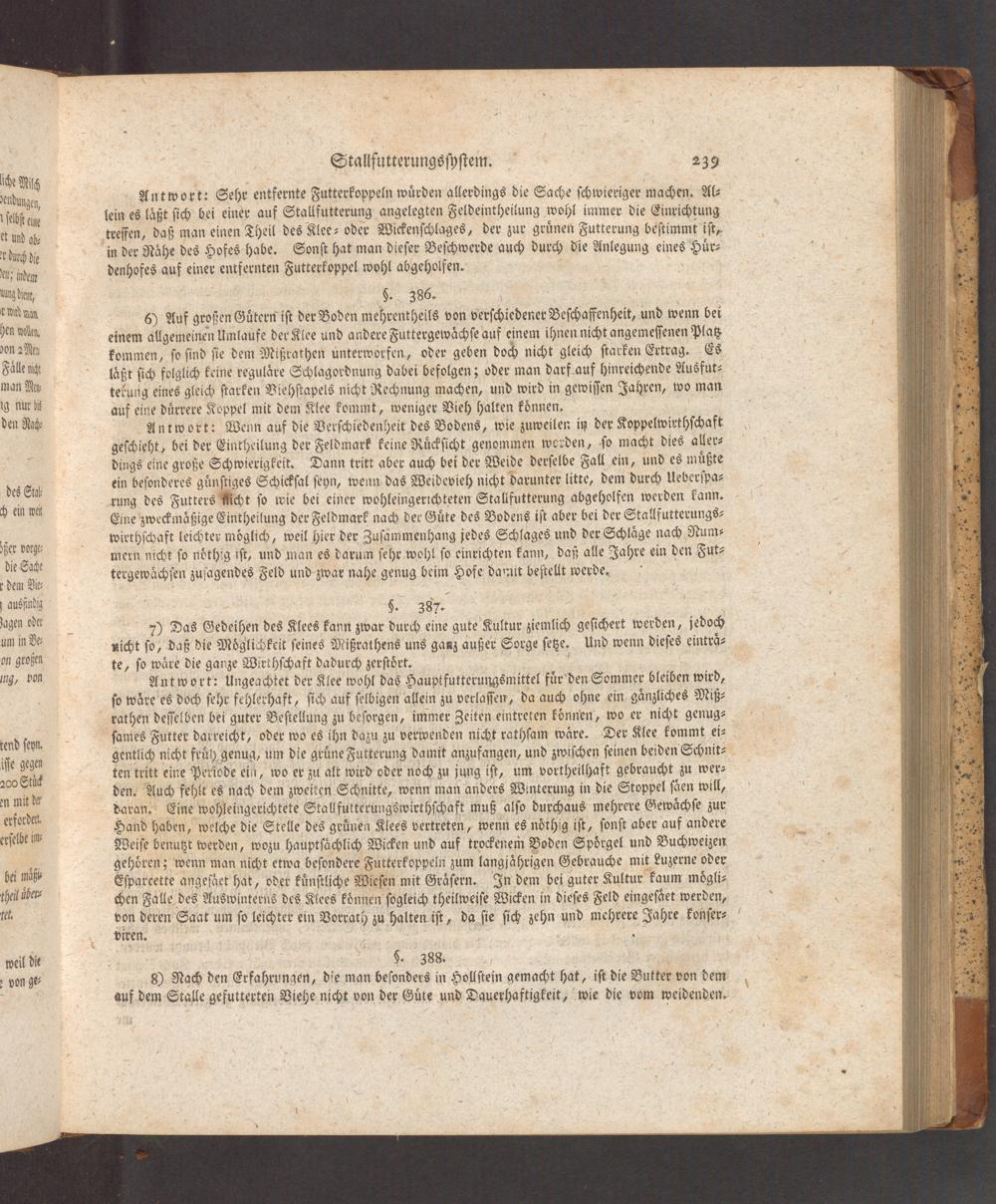 Antwort: Wenn auf die Verſchiedenheit des Bodens, wie zuweilen in der Koppelwirthſchaft geſchieht, bei der Eintheilung der Feldmark keine Ruͤckſicht genommen worden, ſo macht dies aller⸗ dings eine große Schwierigkeit. Dann tritt aber auch bei der Weide derſelbe Fall ein, und es muͤßte ein beſonderes guͤnſtiges Schickſal ſeyn, wenn das Weidevieh nicht darunter litte, dem durch Ueberſpa⸗ rung des Futters Richt ſo wie bei einer wohleingerichteten Stallfutterung abgeholfen werden kann. Eine zweckmaͤßige Eintheilung der Feldmark nach der Guͤte des Bodens iſt aber bei der Stallfutterungs⸗ wirthſchaft leichter moͤglich, weil hier der Zuſammenhang jedes Schlages und der Schlaͤge nach Num⸗ mern nicht ſo noͤthig iſt, und man es darum ſehr wohl ſo einrichten kann, daß alle Jahre ein den Fut⸗ tergewaͤchſen zuſagendes Feld und zwar nahe genug beim Hofe damit beſtellt werde.