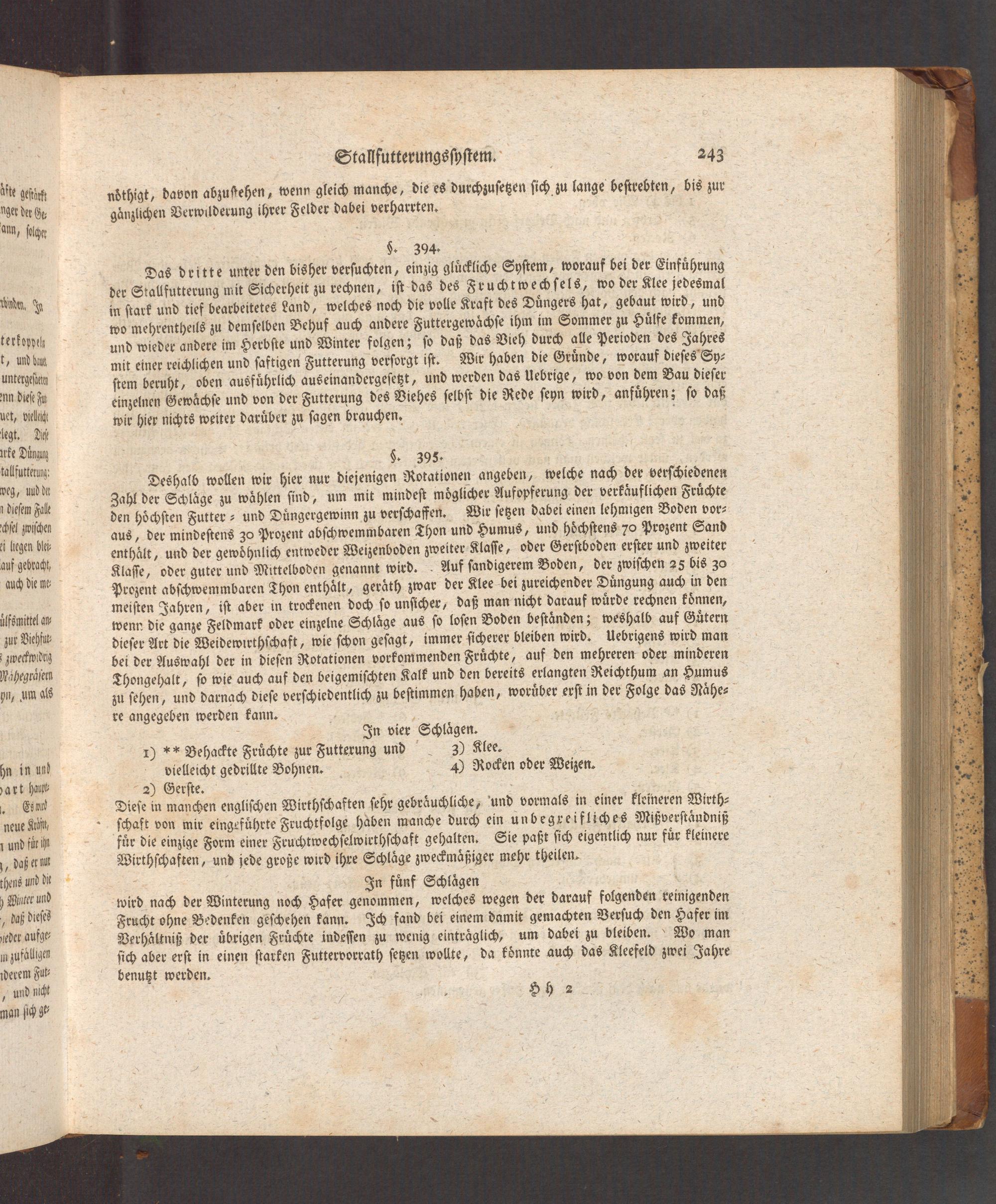 Das dritte unter den bisher verſuchten, einzig gluͤckliche Syſtem, worauf bei der Einfuͤhrung der Stallfutterung mit Sicherheit zu rechnen, iſt das des Fruchtwechſels, wo der Klee jedesmal in ſtark und tief bearbeitetes Land, welches noch die volle Kraft des Duͤngers hat, gebaut wird, und wo mehrentheils zu demſelben Behuf auch andere Futtergewaͤchſe ihm im Sommer zu Huͤlfe kommen, und wieder andere im Herbſte und Winter folgen; ſo daß das Vieh durch alle Perioden des Jahres mit einer reichlichen und ſaftigen Futterung verſorgt iſt. Wir haben die Gruͤnde, worauf dieſes Sy⸗ ſtem beruht, oben ausfuͤhrlich auseinandergeſetzt, und werden das Uebrige, wo von dem Bau dieſer einzelnen Gewaͤchſe und von der Futterung des Viehes ſelbſt die Rede ſeyn wird, anfuͤhren; ſo daß wir hier nichts weiter daruͤber zu ſagen brauchen.