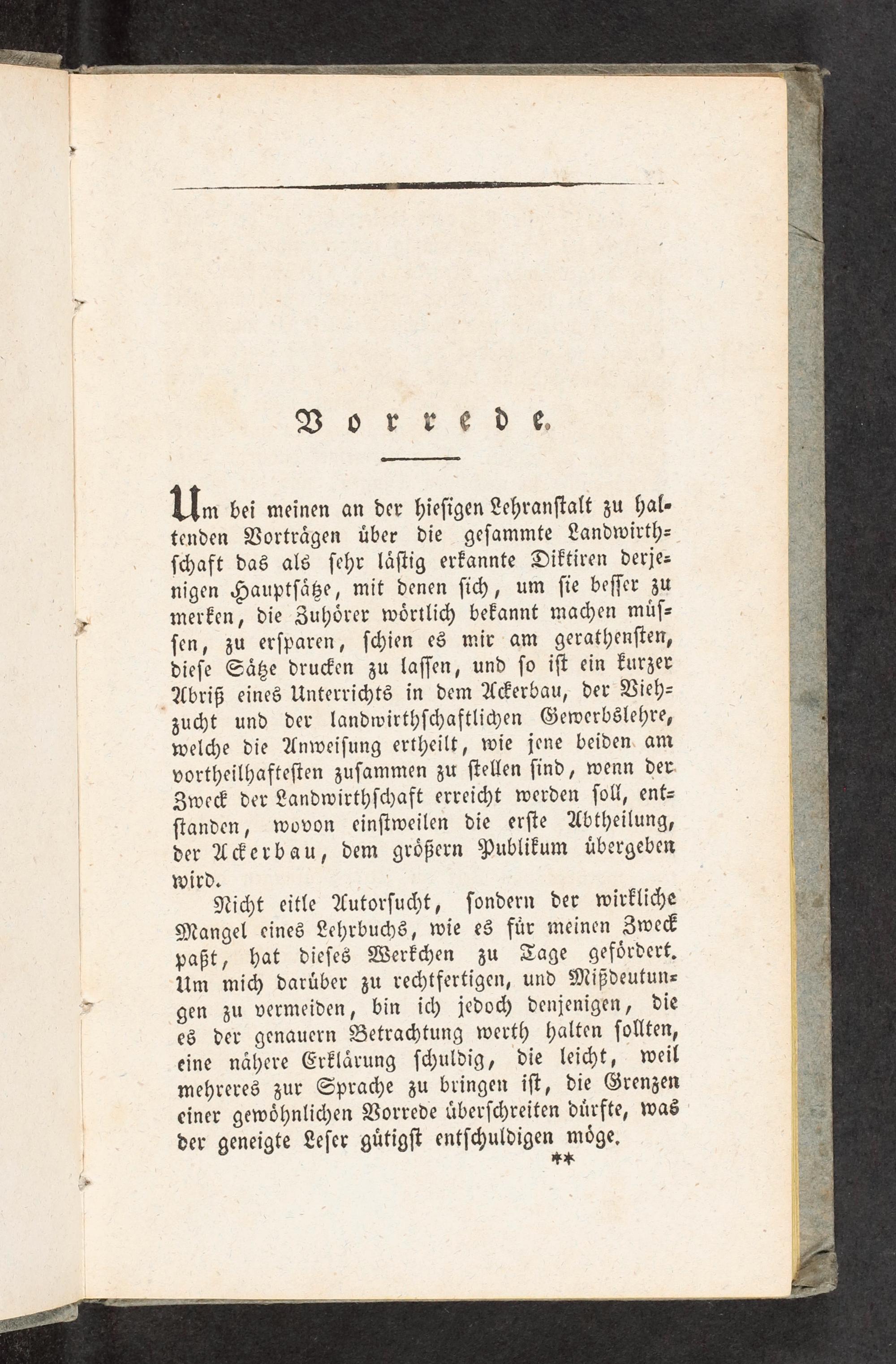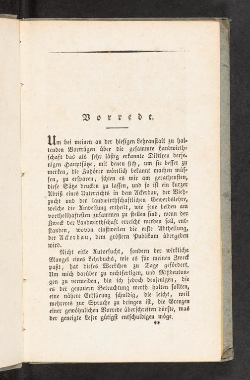 Un bei meinen an der hieſigen Lehranſtalt zu hal⸗ tenden Vortraͤgen uͤber die geſammte Landwirth— ſchaft das als ſehr laͤſtig erkannte Diktiren derje⸗ nigen Hauptſaͤtze, mit denen ſich, um ſie beſſer zu merken, die Zuhoͤrer woͤrtlich bekannt machen muͤſ⸗ ſen, zu erſparen, ſchien es mir am gerathenſten, dieſe Saͤtze drucken zu laſſen, und ſo iſt ein kurzer