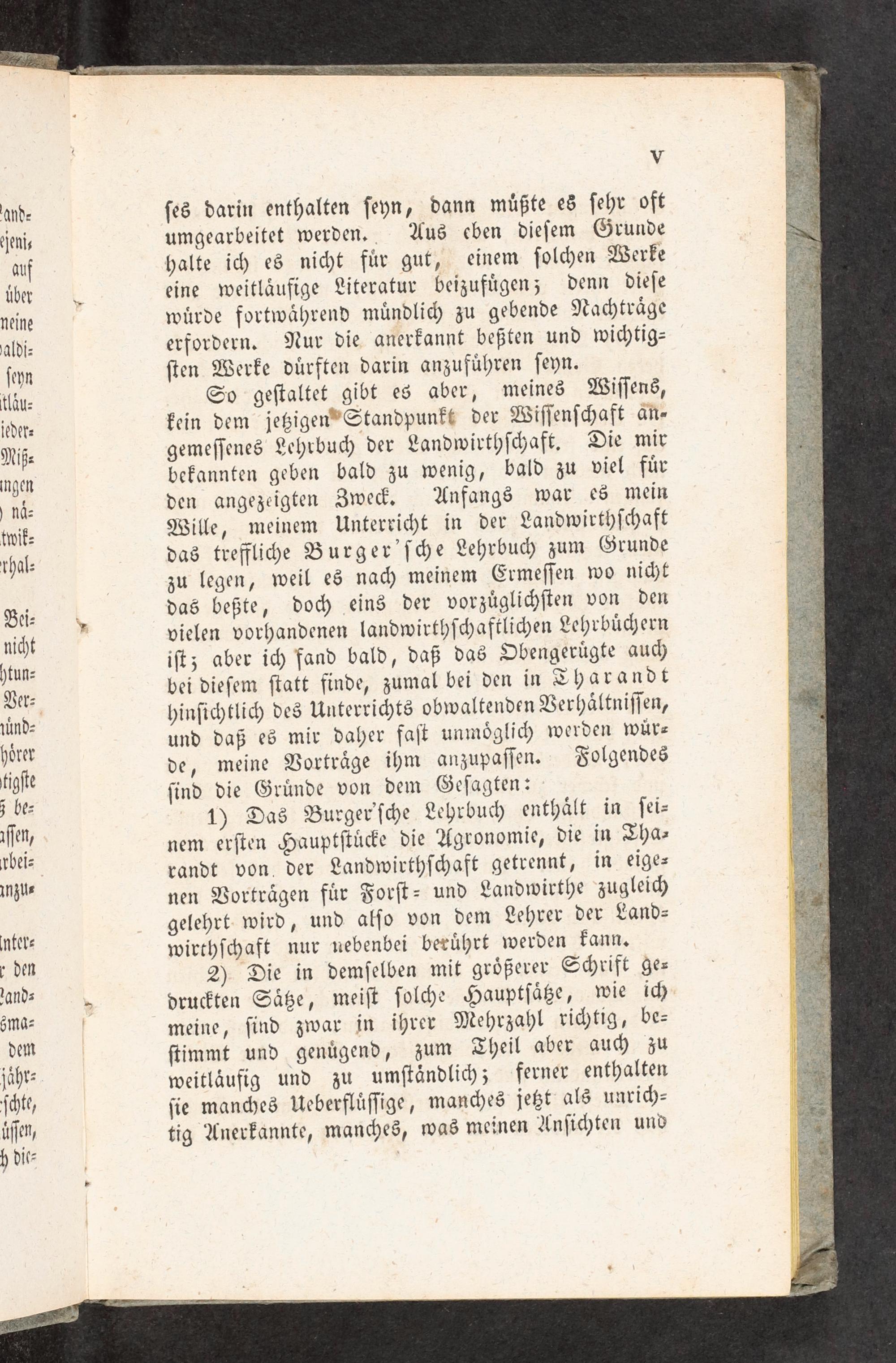 ingen dis den angezeigten Zweck. Anfangs war es mein twik⸗ Wille, meinem Unterricht in der Landwirthſchaft rhal⸗ das treffliche Burger'ſche Lehrbuch zum Grunde zu legen, weil es nach meinem Ermeſſen wo nicht Bei⸗* das beßte, doch eins der vorzuͤglichſten von den nicht vielen vorhandenen landwirthſchaftlichen Lehrbuͤchern htun⸗ iſt; aber ich fand bald, daß das Obengeruͤgte auch Ver⸗ bei dieſem ſtatt finde, zumal bei den in Tharandt ünd⸗ hinſichtlich des Unterrichts obwaltenden Verhaͤltniſſen, horer und daß es mir daher faſt unmoͤglich werden wuͤr⸗ tigſt de, meine Vortraͤge ihm anzupaſſen. Folgendes zbe⸗ ſind die Gruͤnde von dem Geſagte: iſen 1) Das Burger ſche Lehrbuch enthaͤlt in ſei⸗ deir nem erſten Hauptſtuͤcke die Agronomie, die in Tha⸗ Tbfi⸗ randt von der Landwirthſchaft getrennt, in eige⸗ määe nen Vortraͤgen fuͤr Forſt- und Landwirthe zugleich gelehrt wird, und alſo von dem Lehrer der Land⸗ nter⸗ wirthſchaft nur nebenbei beruͤhrt werden kann. da 2) Die in demſelben mit groͤßerer Schrift ge— and⸗. druckten Saͤtze, meiſt ſolche Hauptſaͤtze, wie ich Emma⸗ meine, ſind zwar in ihrer Mehrzahl richtig, be⸗ dem ſtimmt und genuͤgend, zum Theil aber auch zu jähr⸗ weitlaͤufig und zu umſtaͤndlich; ferner enthalten ſcht⸗ ſie manches Ueberfluͤſſige, manches jetzt als unrich⸗ iſſen, tig Anerkannte, manches, was meinen Anſichten und