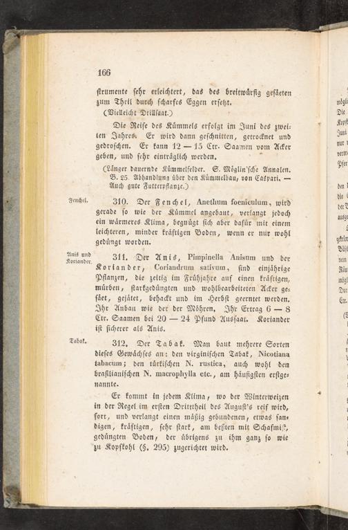 310. Der Fenchel, Anethum ſoeniculum, wird gerade ſo wie der Kuͤmmel angebaut, verlangt jedoch ein waͤrmeres Klima, begnuͤgt ſich aber dafuͤr mit einem leichteren, minder kraͤftigen Boden, wenn er nur wohl geduͤngt worden.