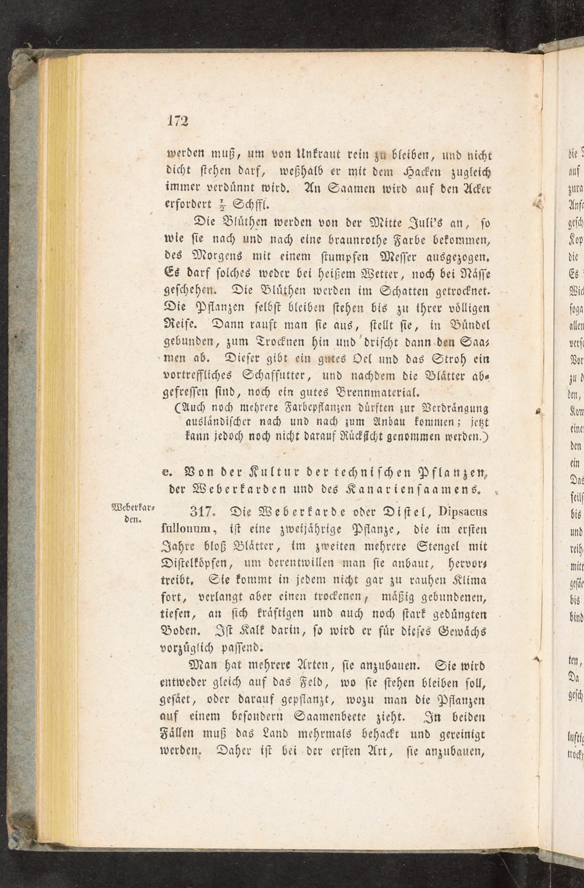 317. Die Weberkarde oder Diſtel, Dipsacus fullonum, iſt eine zweijaͤhrige Pflanze, die im erſten Jahre bloß Blaͤtter, im zweiten mehrere Stengel mit Diſtelkoͤpfen, um derentwillen man ſie anbaut, hervor— treibt. Sie kommt in jedem nicht gar zu rauhen Klima fort, verlangt aber einen trockenen, maͤßig gebundenen, tiefen, an ſich kraͤftigen und auch noch ſtark geduͤngten Boden. Iſt Kalk darin, ſo wird er fuͤr dieſes Gewaͤchs vorzuͤglich paſſend.