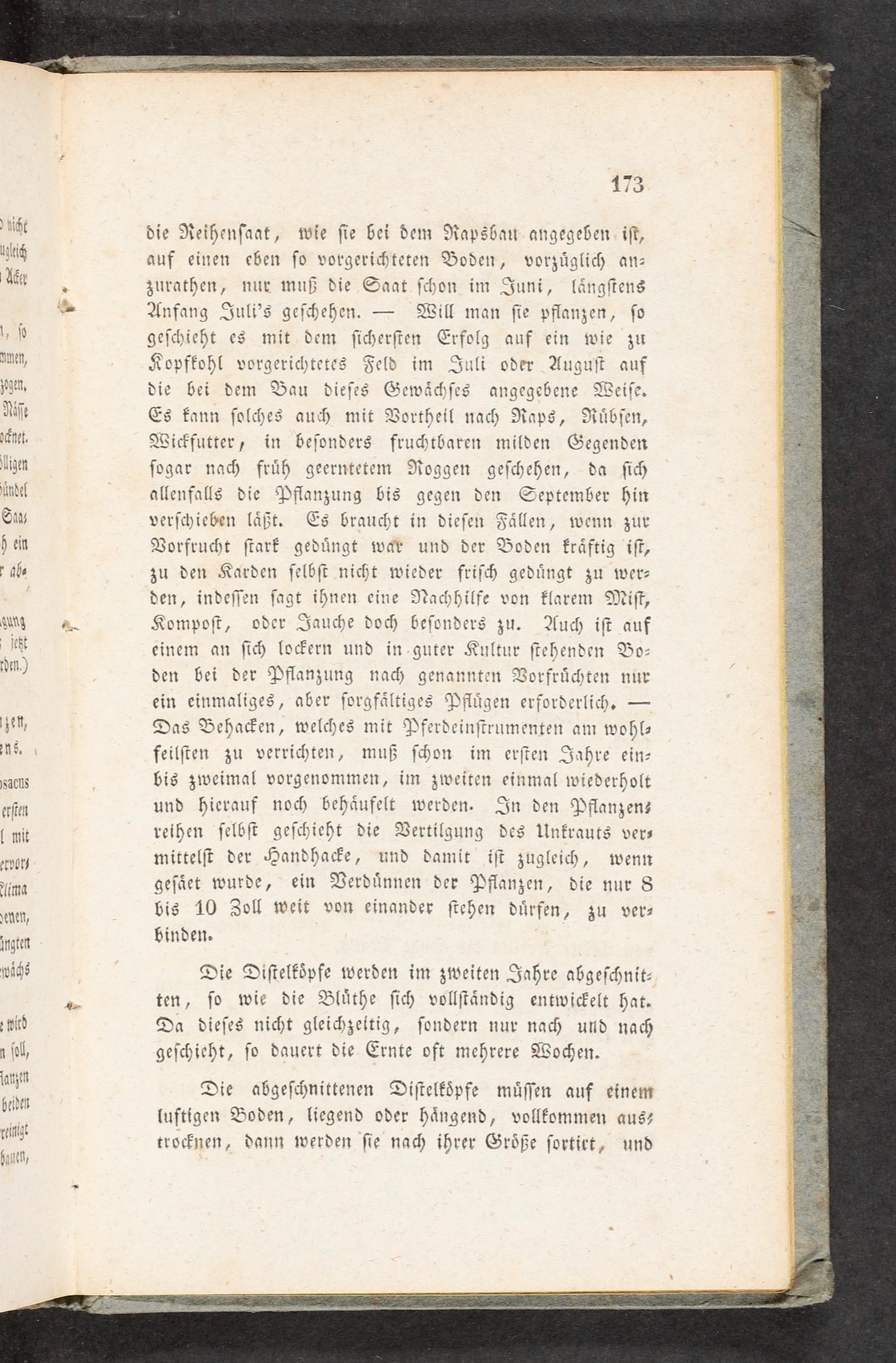 — Anfang Juli's geſchehen.— Will man ſie pflanzen, ſo 1, ſp geſchieht es mit dem ſicherſten Erfolg auf ein wie zu amen, Kopfkohl vorgerichtetes Feld im Juli oder Auguſt auf zagen. die bei dem Bau dieſes Gewaͤchſes angegebene Weiſe. Riſe Es kann ſolches auch mit Vortheil nach Raps, Ruͤbſen, ocknet. Wickfutter, in beſonders fruchtbaren milden Gegenden igen ſogar nach fruͤh geerntetem Roggen geſchehen, da ſich ündel allenfalls die Pflanzung bis gegen den September hin Sna⸗ verſchieben laͤßt. Es braucht in dieſen Faͤllen, wenn zur h ein Vorfrucht ſtark geduͤngt war und der Boden krlaͤftig iſt, ah⸗ zu den Karden ſelbſt nicht wieder friſch geduͤngt zu wer— den, indeſſen ſagt ihnen eine Nachhilfe von klarem Miſt, ung— Kompoſt, oder Jauche doch beſonders zu. Auch iſt auf ſeht einem an ſich lockern und in guter Kultur ſtehenden Bo— den.) den bei der Pflanzung nach genannten Vorfruͤchten nur ein einmaliges, aber ſorgfaͤltiges Pfluͤgen erforderlich.— zzen, Das Behacken, welches mit Pferdeinſtrumenten am wohl⸗ ens. feilſten zu verrichten, muß ſchon im erſten Jahre ein— SaclS bis zweimal vorgenommen, im zweiten einmal wiederholt erſte und hierauf noch behaͤufelt werden. In den Pflanzen⸗ mi reihen ſelbſt geſchieht die Vertilgung des Unkrauts ver⸗ ervorz mittelſt der Handhacke, und damit iſt zugleich, wenn Lima geſaͤtt wurde, ein Verduͤnnen der Pflanzen, die nur 8 delen bis 10 Zoll weit von einander ſtehen duͤrfen, zu ver⸗ 5 ingten binden. wichs Die Diſtelkoͤpfe werden im zweiten Jahre abgeſchnit— — ten, ſo wie die Bluͤthe ſich vollſtaͤndig entwickelt hat. ewied Da dieſes nicht gleichzeitig, ſondern nur nach und nach ſel, geſchieht, ſo dauert die Ernte oft mehrere Wochen. Wni Die abgeſchnittenen Diſtelkoͤpfe muͤſſen auf einem hen luftigen Boden, liegend oder haͤngend, vollkommen aus⸗ nt trocknen, dann werden ſie nach ihrer Groͤße ſortirt, und bauen,
