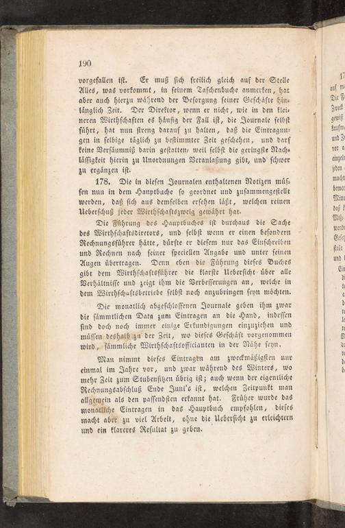 vorgefallen iſt. Er muß ſich freilich gleich auf der Stelle Alles, was vorkommt, in ſeinem Taſchenbuche anmerken, hat aber auch hierzu waͤhrend der Beſorgung ſeiner Geſchaͤfte hin⸗ laͤnglich Zeit. Der Direktor, wenn er nicht, wie in den klei⸗ neren Wirthſchaften es haͤufig der Fall iſt, die Journale ſelbſt fuͤhrt, hat nun ſtreng darauf zu halten, daß die Eintragun⸗ gen in ſelbige taͤglich zu beſtimmter Zeit geſchehen, und darf keine Verſaͤumniß darin geſtatten, weil ſelbſt die geringſte Nach⸗ laͤſſigkeit hierin zu Unordnungen Veroulaund gibt, und ſchwer zu ergaͤnzen iſt.