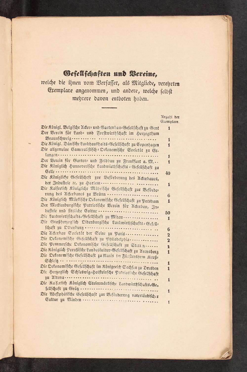 Anzahl der Exemplare. Die Koͤnigl. Belgiſche Acker⸗ und Gartenbau⸗ Geſellſchaft zu Gent 1 Der Verein fuͤr Land- und Serwirisſhafe im Braunſchweig⸗ 1 Die Koͤnigl. Daͤn ſche Landhaushalts⸗'Geſellſchaft z zu pehagen 1 Die allgemeine Cameraliſtiſch-Oekonomiſche Societaͤt zu Er.