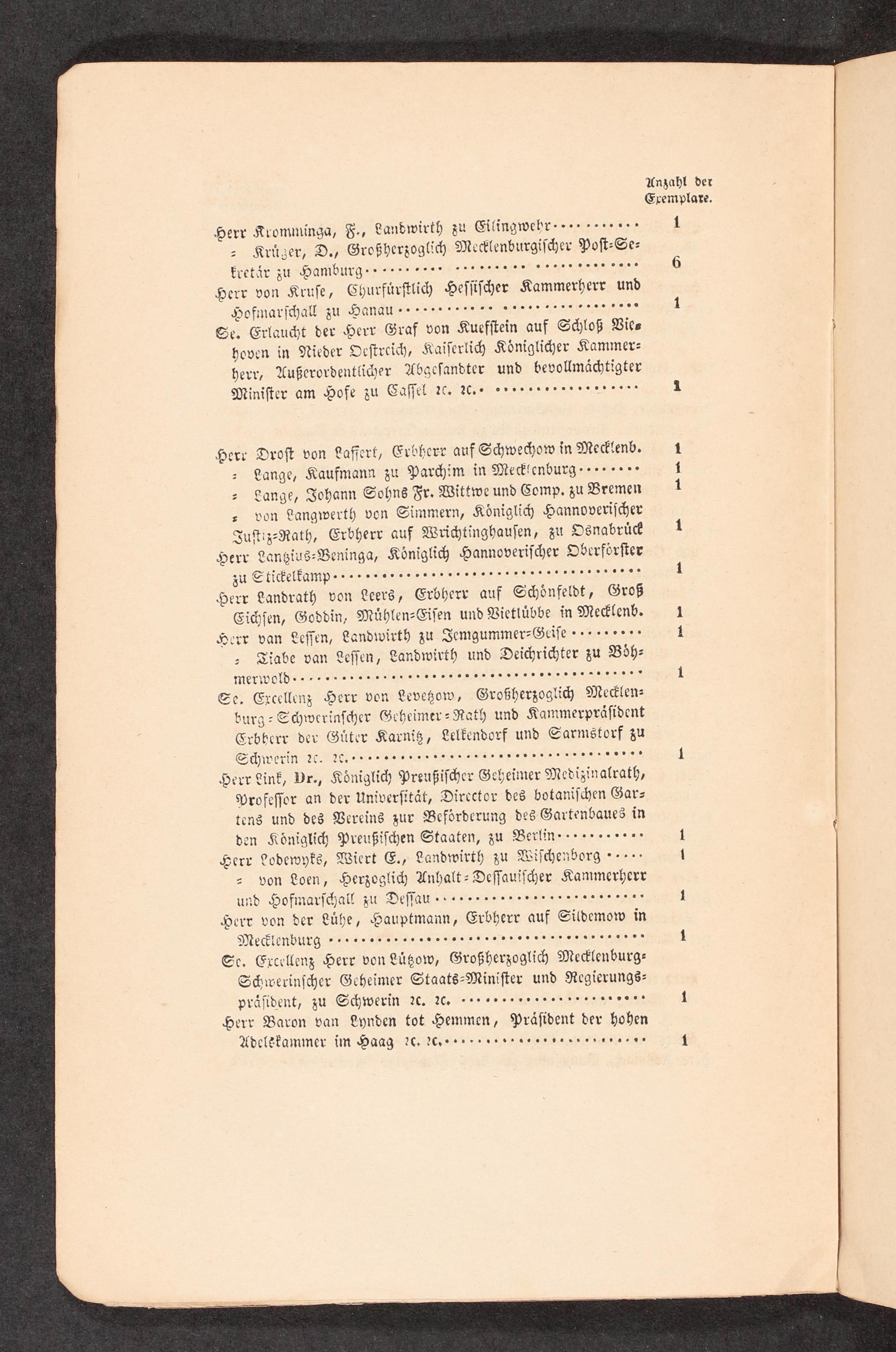 Miniſter am Hofe zu Caſſel ꝛc. ac.... 1 Herr Droſt von Lafſert, Erbherr auf Schwechow in Mecklenb. 1 „ Lange, Kaufmann zu Parchim in Mecklenburr.... 1