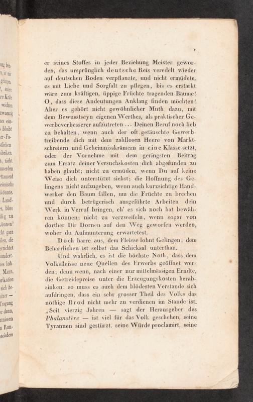Und wahrlich, es ist die höchste Noth, dass dem Volksileisse neue Quellen des Erwerbs geöffnet wer- den; denn wenn, nach einer nur mittelmässigen Erndte, die Getreidepreise unter. die Erzeugungskosten herab- sinken: so muss es auch dem blödesten Verstande sich aufdringen, dass ein/sehr grosser Theil des Volks das nöthige Brod nicht mehr zu verdienen im Stande’ist, „Seit vierzig Jahren— sagt der Herausgeber des Phalanstere— ist viel für das Volk geschehen, seine Tyrannen sind gestürzt, seine Würde proclamirt, seine