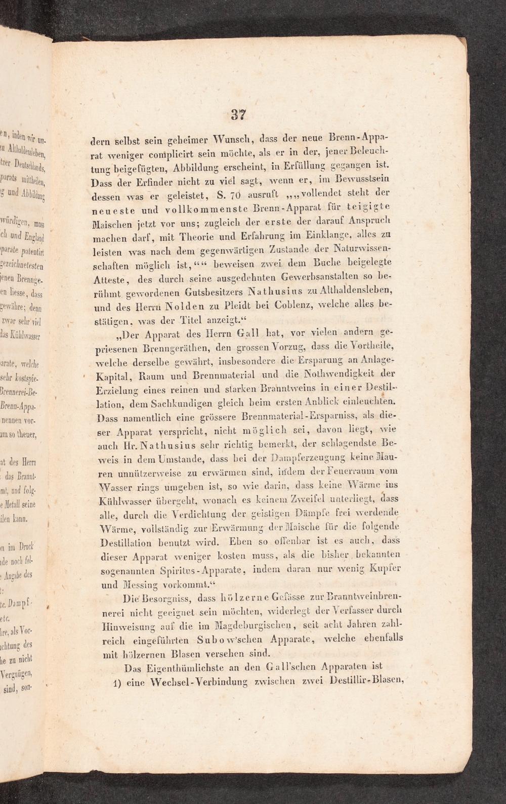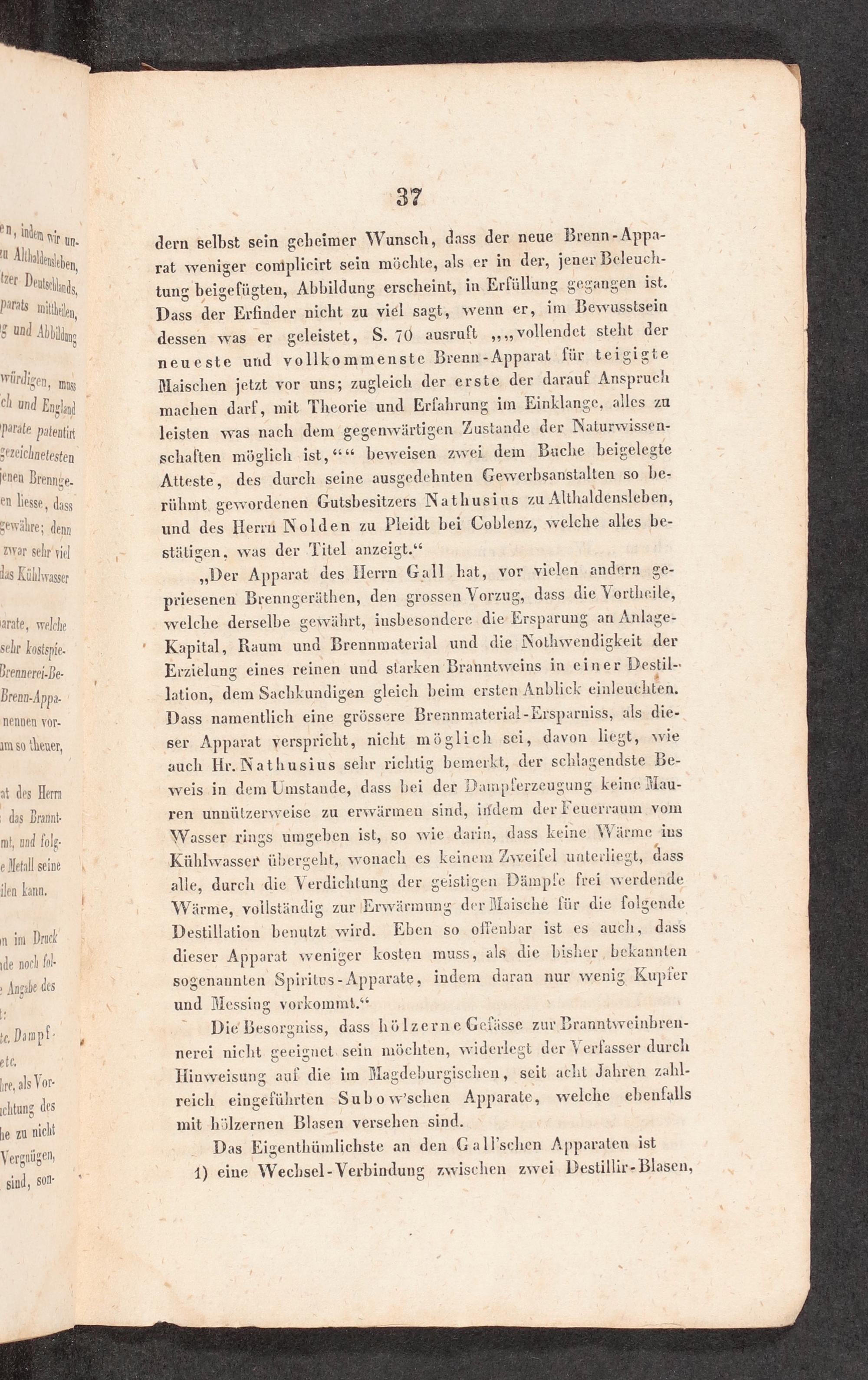 „Der Apparat des Herrn Gall hat, vor vielen ‚andern ge- priesenen Brenngeräthen, den grossen Vorzug, dass die Vortheile, welche derselbe gewährt, insbesondere die Ersparung an Anlage- Kapital, Raum und Brennmaterial und die Nothwendigkeit der Erzielung eines reinen und starken Branntweins in einer Destil- lation, dem Sachkundigen gleich beim ersten Anblick einleuchten. Dass namentlich eine grössere Brennmaterial-Ersparniss, als die- ser Apparat verspricht, nicht möglich sei, davon liegt, wie auch Hr. Nathusius sehr richtig bemerkt, der schlagendste Be- weis in dem Umstande, dass bei der Dampferzeugung keine Mau- ren unnülzerywveise zu erwärmen sind, iıfderm der Feuerraum vom Wasser rings umgeben ist, so wie darin, dass keine Wärme ins Kühlwasser übergeht, wonach es keinem Zwveilel unterliegt, dass alle, durch die Verdichtung der geistigen Dämpfe frei werdende Wärme, vollständig zur Erwärmung der Maische für die folgende Destillation benutzt wird. Eben so offenbar ist es auch, dass dieser Apparat weniger kosten muss, als die bisher, bekannten sogenannten Spiritus- Apparate, indem daran nur wenig Kupier und Messing vorkommt.“