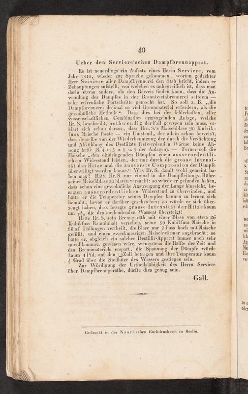 Es ist neuerdings’ ein Aufsatz eines Herrn Serviere, vom Jahr 1810, wieder zur Sprache gekommen, worinn gedachter Herr Serviere aller Dampfbrennerei den Stab bricht, indem er Behauptungen aufstellt, von tvelchen es unbegreillich ist, dass man darin etwas anders, als den Beweis finden kann, dass die An- wendung des Dampfes in der Branntweinbrennerei seitdem— schr erfreuliche Fortschritte gemacht hat. So soll z. B.„die Dampfbrennerei dreimal so viel Brennmaterial erfordern, als die gewöhnliche Methode.“ Dass dies bei der fehlerhaften, aller wissenschaftlichen Combination ermangelnden Anlage, welche Hr. S. beschreibt, nothwendig der Fall gewesen sein muss, er- klärt sich schon daraus, dass Hrn. S.’s Maischblase 90 Kubik- fuss Maische fasste— ein Umstand, der allein schon beweis't, dass derselbe von der Wiederbenutzung der durch die Verdichtung und Abkühlung des Destillats freiwerdenden\Yärme. keine Ah- nung hatte(5.4 u.5 u.5 u.9 der Anlagen).— Ferner soll die Maische„den eindringenden Dämpfen einen ausserordentli- chen Widerstand leisten, der nur durch die grosse Intensi- tät der Hitze und die äusserste Compression der Dämpfe überwältigt werden könne.“ Was Hr. S. damit wohl gemeint ha- ben mag? Hätte Hr. S.'nur einmal in die Damplleitungs- Röhre seiner Maischblase zu blasen versucht: so würde er gefunden haben, dass schon eine gewöhnliche Anstrengung der Lunge hinreicht, be- sagten ausserordentlichen Widerstand zu überwinden, und hätte er die Temperatur seines Dampfes kennen zu lernen sich bemüht, bevor er darüber, geschrieben; so würde er sich über- zeugt haben, dass besagte grosse Intensität derHitzekaum um„!, die des siedendenden\Vassers übersteigt!