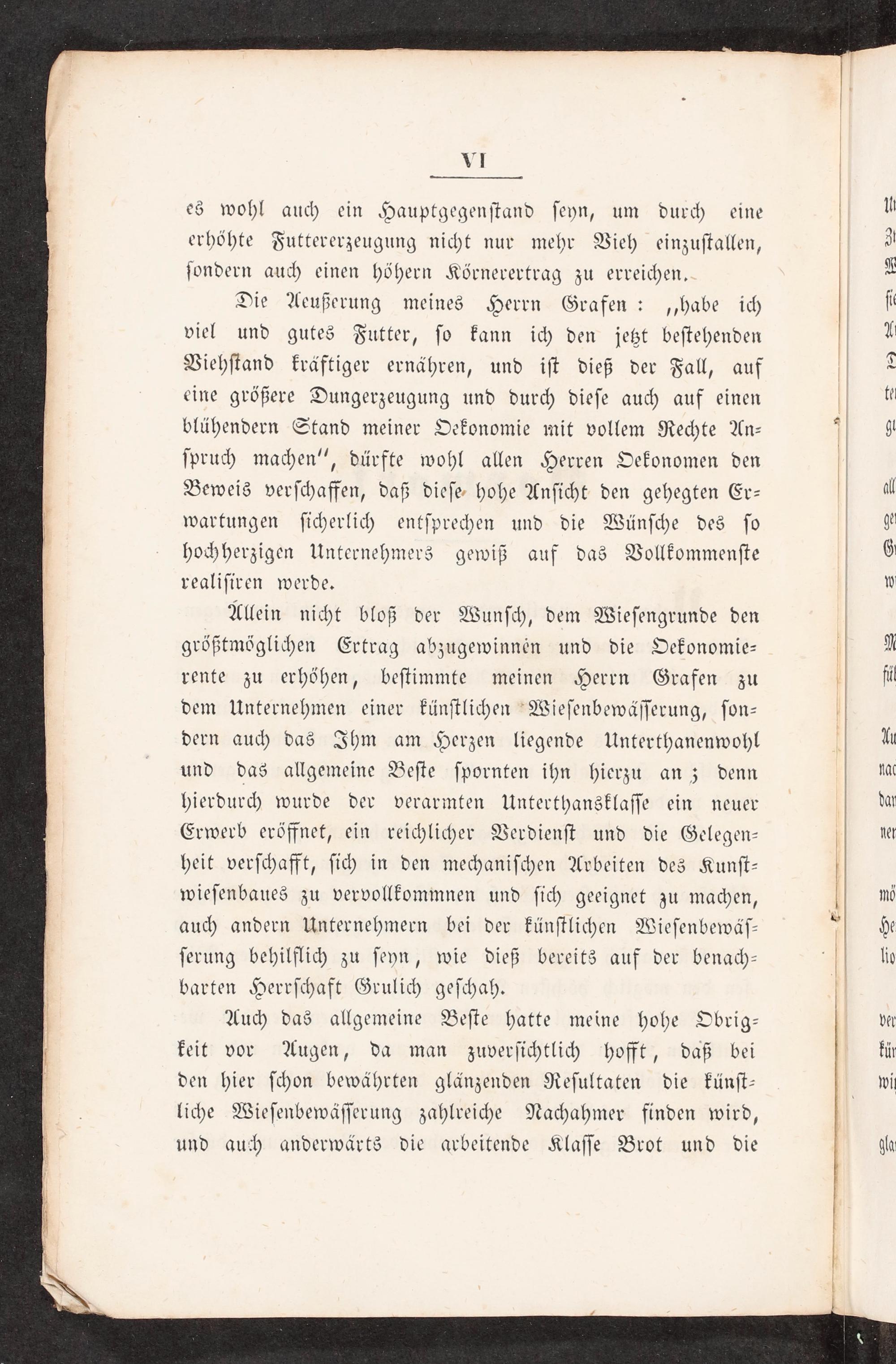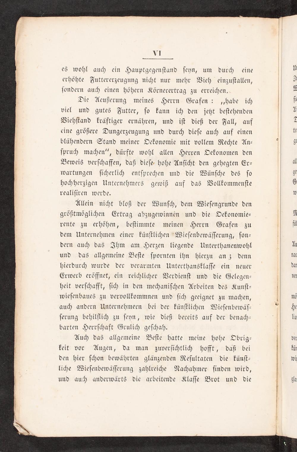 Allein nicht bloß der Wunſch, dem Wieſengrunde den größtmöglichen Ertrag abzugewinneén und die Oekonomie— rente zu erhöhen, beſtimmte meinen Herrn Grafen zu dem Unternehmen einer künſtlichen Wieſenbewäſſerung, ſon— dern auch das Ihm am Herzen liegende Unterthanenwohl und das allgemeine Beſte ſpornten ihn hierzu an; denn hierdurch wurde der verarmten Unterthansklaſſe ein neuer Erwerb eröffnet, ein reichlicher Verdienſt und die Gelegen— heit verſchafft, ſich in den mechaniſchen Arbeiten des Kunſt— wieſenbaues zu vervollkommnen und ſich geeignet zu machen, auch andern Unternehmern bei der künſtlichen Wieſenbewäſ— ſerung behilflich zu ſeyn, wie dieß bereits auf der benach— barten Herrſchaft Grulich geſchah.