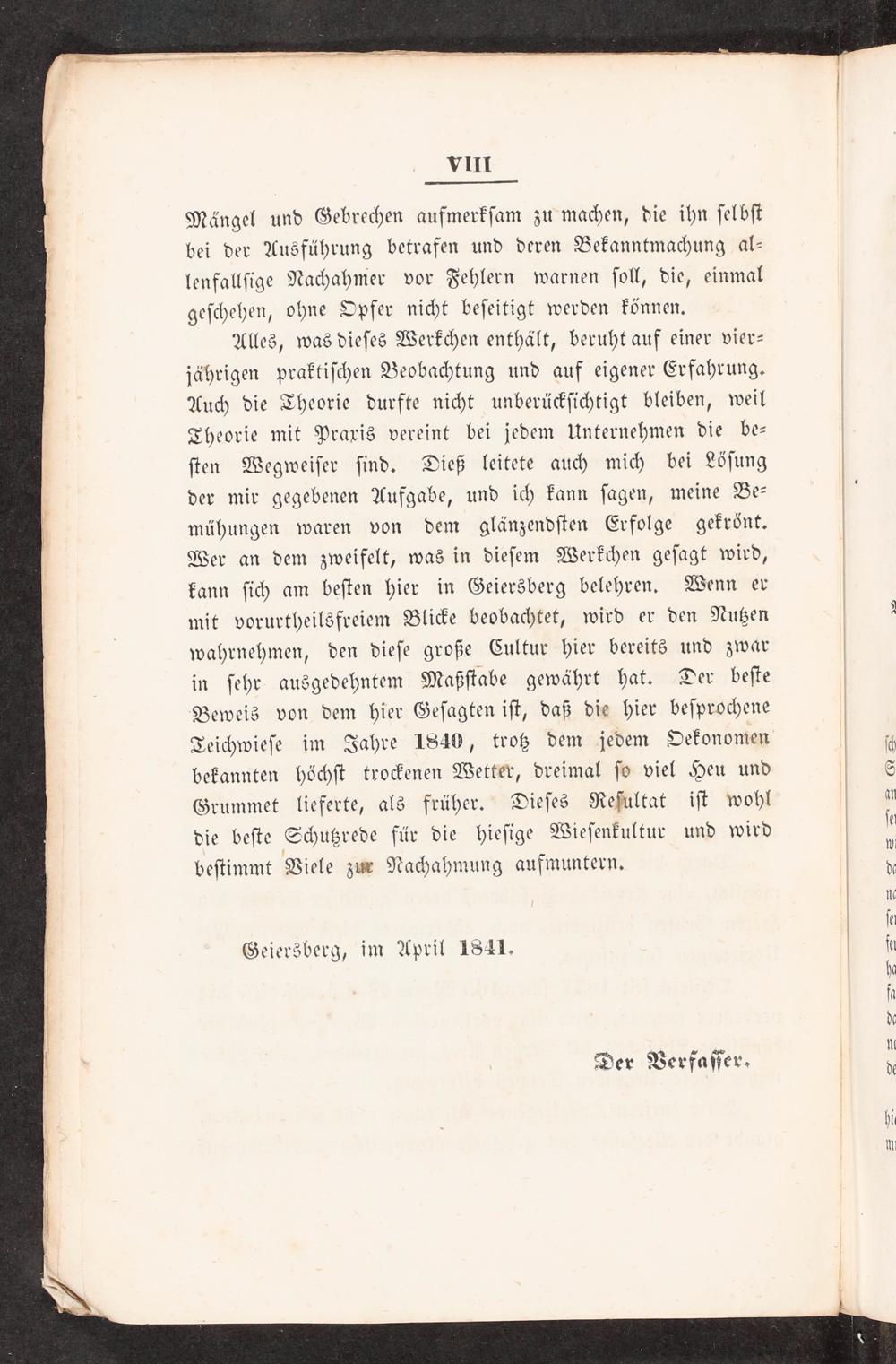 Alles, was dieſes Werkchen enthält, beruht auf einer vier— jährigen praktiſchen Beobachtung und auf eigener Erfahrung. Auch die Theorie durfte nicht unberückſichtigt bleiben, weil Theorie mit Praxis vereint bei jedem Unternehmen die be⸗ ſten Wegweiſer ſind. Dieß leitete auch mich bei Löſung der mir gegebenen Aufgabe, und ich kann ſagen, meine Be— mühungen waren von dem glaͤnzendſten Erfolge gekrönt. Wer an dem zweifelt, was in dieſem Werkchen geſagt wird, kann ſich am beſten hier in Geiersberg belehren. Wenn er mit vorurtheilsfreiem Blicke beobachtet, wird er den Nutzen wahrnehmen, den dieſe große Cultur hier bereits und zwar in ſehr ausgedehntem Maßſtabe gewährt hat. Der beſte Beweis von dem hier Geſagten iſt, daß die hier beſprochene Teichwieſe im Jahre 1840, trotz dem jedem Oekonomen bekannten höchſt trockenen Wetter, dreimal ſo viel Heu und Grummet lieferte, als früher. Dieſes Reſultat iſt wohl die beſte Schutzrede für die hieſige Wieſenkultur und wird beſtimmt Viele zue Nachahmung aufmuntern.